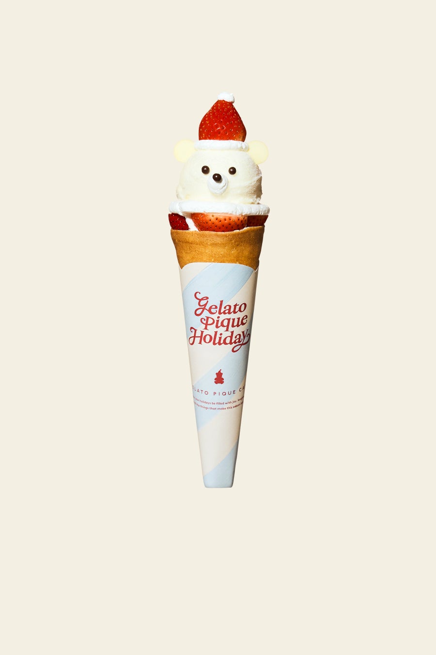 ジャージー牛乳の濃厚ミルクジェラートに、いちご帽子のピケベアをのせたホリデークレープ。