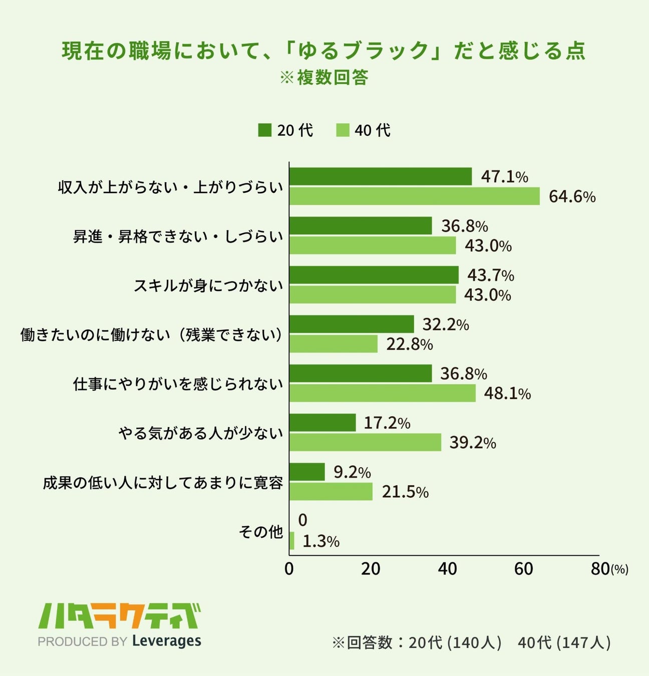 職場が「ゆるブラック」だと感じる点について、40代より20代の回答割合が上回ったのは「スキルが身につかない(20代:43.7% 40代:43.0%)」「働きたいのに働けない(残業できない)(20代:32.2% 40代:22.8%)」でした。