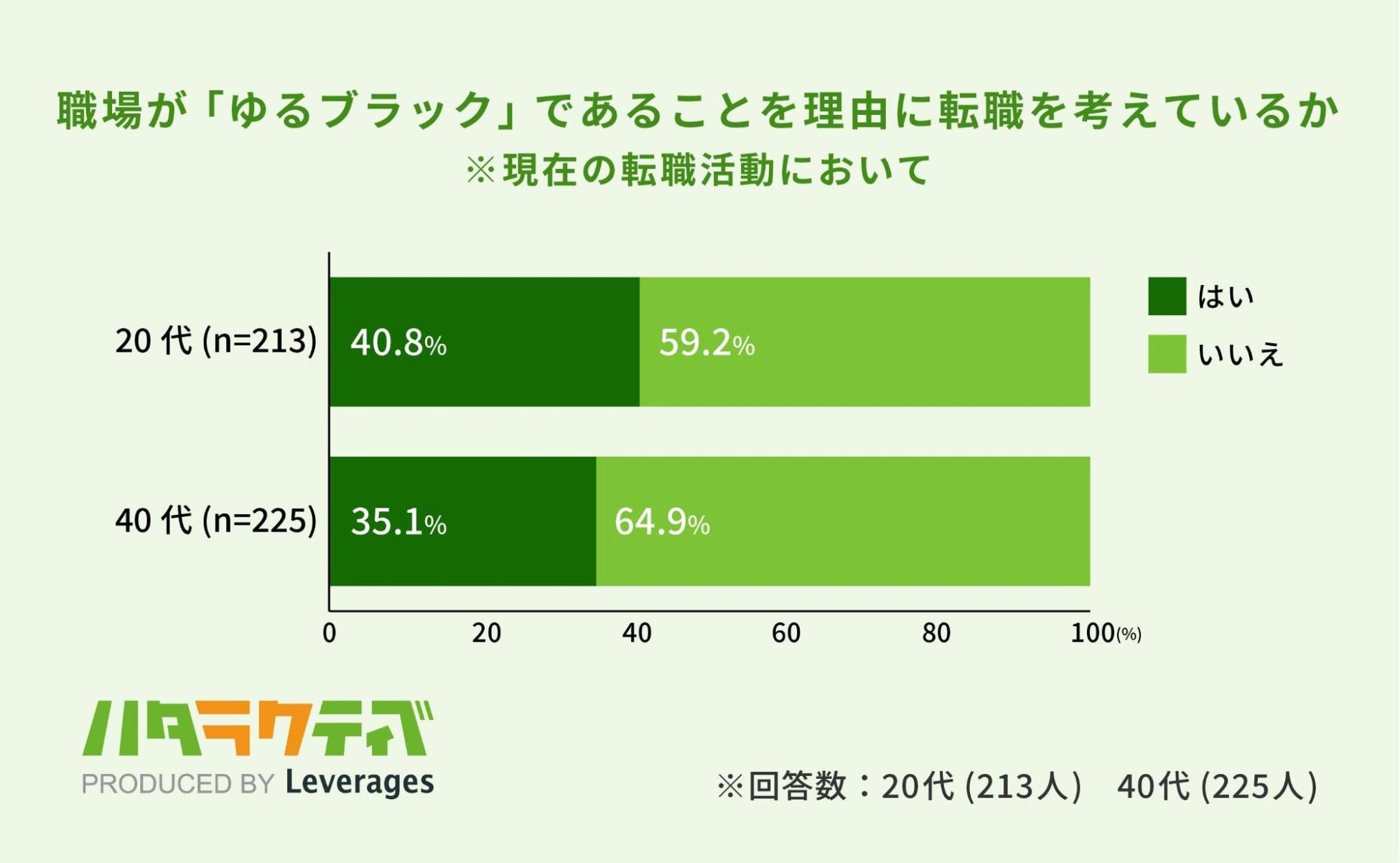 「ゆるブラック」を「仕事は楽だが、成長できずスキルアップやキャリアアップも難しい職場」と定義した上で、現在の転職活動理由について聞いたところ、20代では40.8%、40代では35.1%が「企業が『ゆるブラック』であることが理由である」と回答しました。