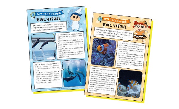 館内5箇所にオリジナル解説パネルを設置します。『クレヨンしんちゃん』の主要キャラクターたちが扮した、『うみがたり』の5種の生きものの生態について学べます。