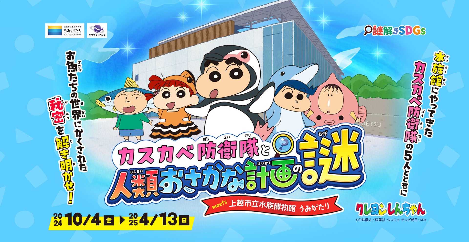 上越市立水族博物館『うみがたり』では、令和6年10月4日(金)~令和7年4月13日(日)の期間、漫画やアニメで大人気の作品である『クレヨンしんちゃん』とコラボレーションし、海の生きものをテーマにした謎解きイベント「カスカベ防衛隊と人類おさかな計画の謎meets上越市立水族博物館 うみがたり」を開催します。