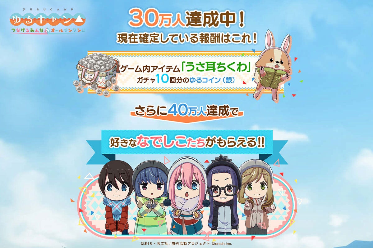 「ゆるキャン△ つなげるみんなのオールインワン!!」の事前登録者数30万人突破報酬として、ゲーム内で一緒にキャンプを楽しむことができる、「うさ耳ちくわ」と「ガチャ10回分のゆるコイン(銀)」の配布を決定いたしました。