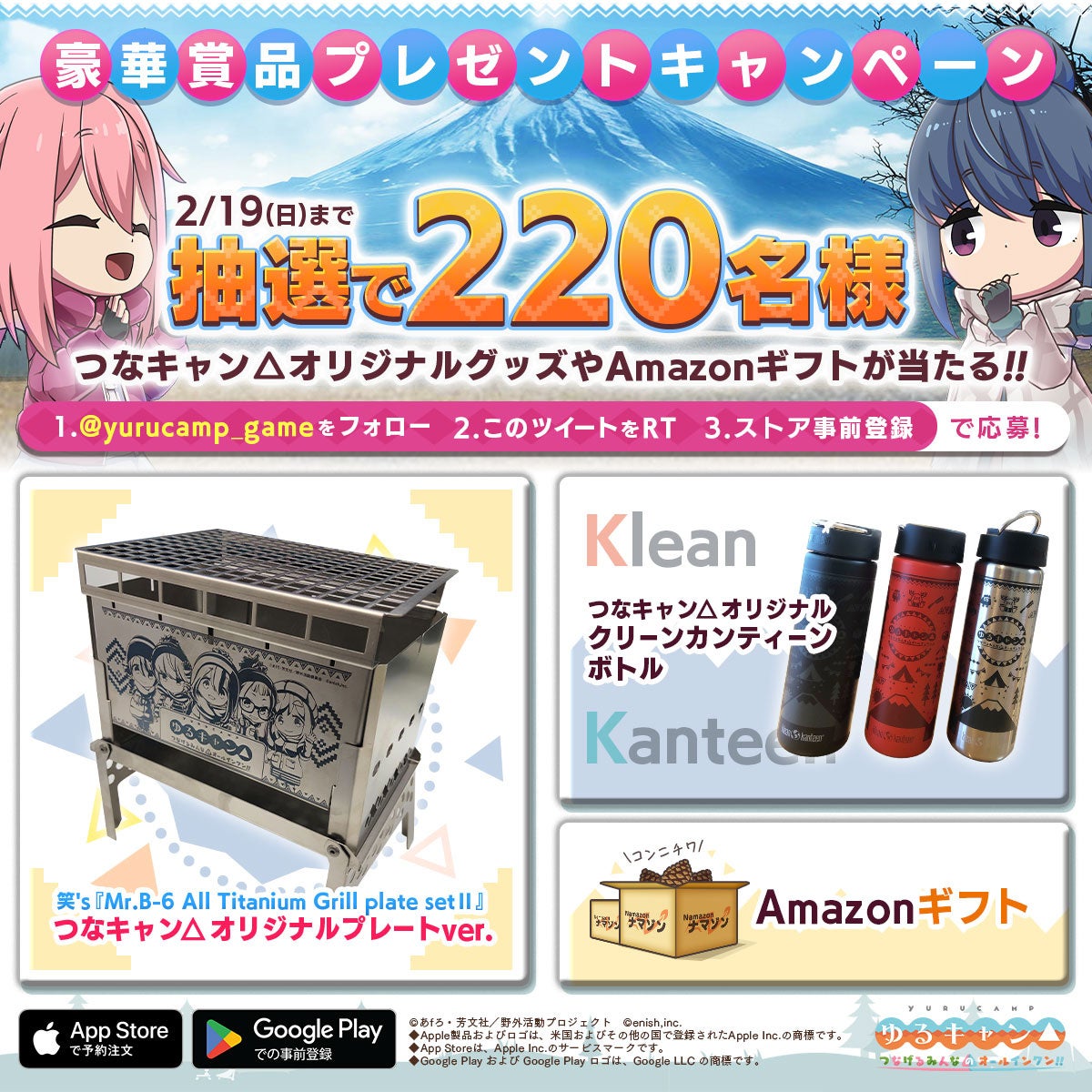 「ゆるキャン△ つなげるみんなのオールインワン!!」ゲームアプリをApp StoreとGoogle Playより、ストア事前予約していただいた方から抽選で220名様にゲームオリジナルグッズやAmazonギフト券が当たる豪華賞品プレゼントキャンペーンが絶賛実施中です。