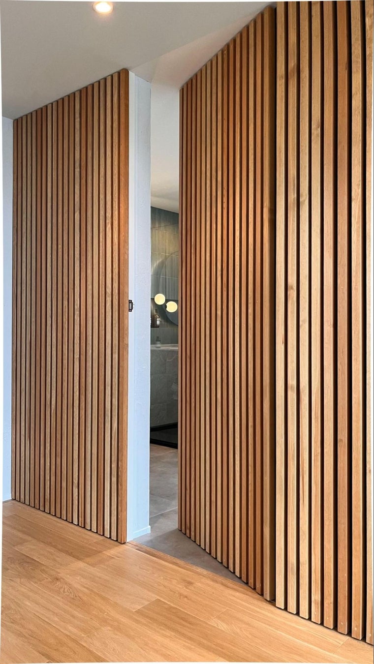 リビングと洗面室を間仕切る縦格子の壁面。壁面と一体化した扉でスッキリした空間に。