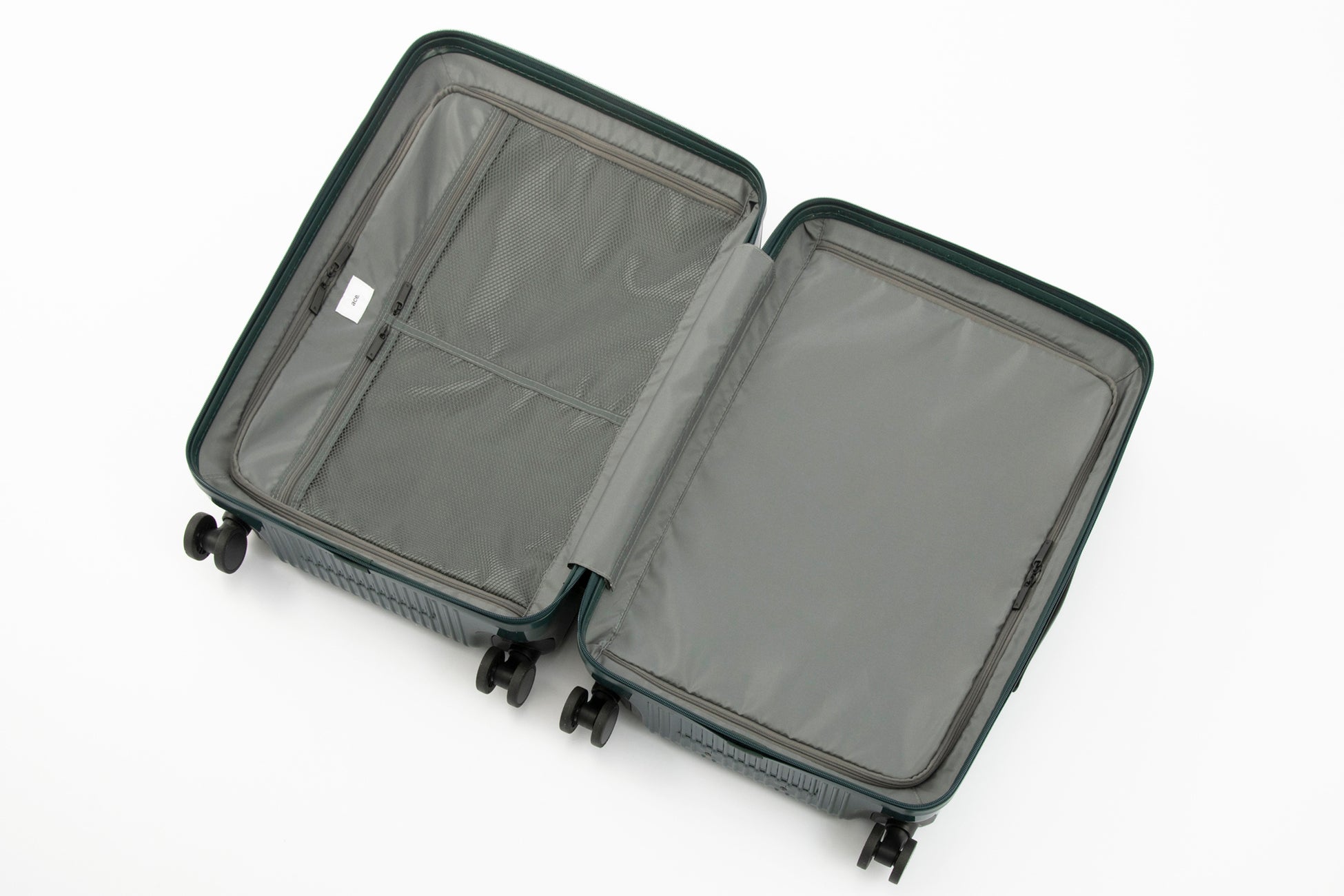 スーツケースを開けた際の荷こぼれを防ぐ、ファスナー開閉式の収納スペース。