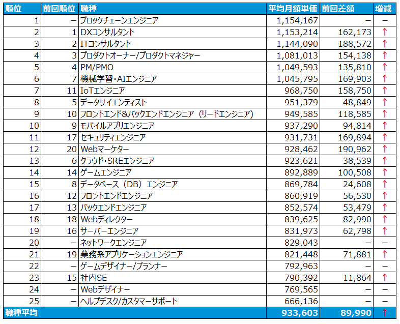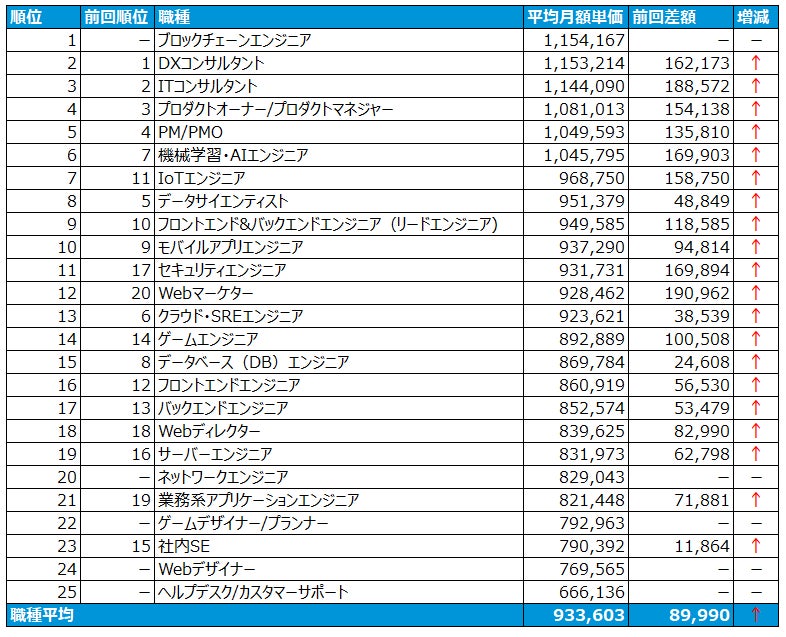 ~職種別の平均月額単価は93.3万円(昨対比+8.9万円)、トップは昨年圏外だった「ブロックチェーンエンジニア」で115.4万円~