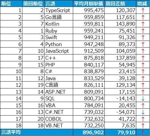 また、モバイルアプリ開発で使用される言語の「Kotlin」(3位、95.9万円)、「Swift」(5位、94.9万円)も上位にランクインしました。「Kotlin」は、前回から14.3万円アップし最も単価が増加しています。これは、メーカーや小売などの事業会社が新規事業の一環で既存サービスをモバイルアプリ化する動きが高まっていること、スタートアップも継続的に新規アプリをリリースしていることなどが要因といえるでしょう。