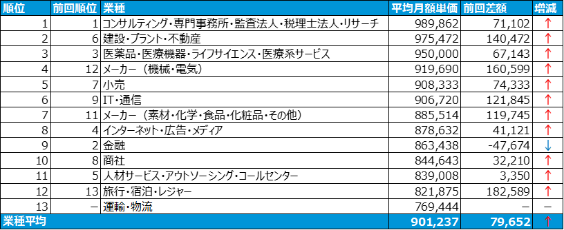 業種別で見ると、「コンサルティング・専門事務所・監査法人・税理士法人・リサーチ」が最も高く98.9万円で、前回から7.1万円アップしました。DXの広がりに合わせコンサルティング業は、戦略設計のような最上流工程だけでなく、システム導入・運用といった実業務に近い領域にまで業務範囲を広げています。また、細分化する企業ニーズに応えるために、専門特化したコンサルティング業も増えています。業務範囲が拡大したことや、これまで以上に専門性が求められるようになったことで、高単価になったと考えられます。