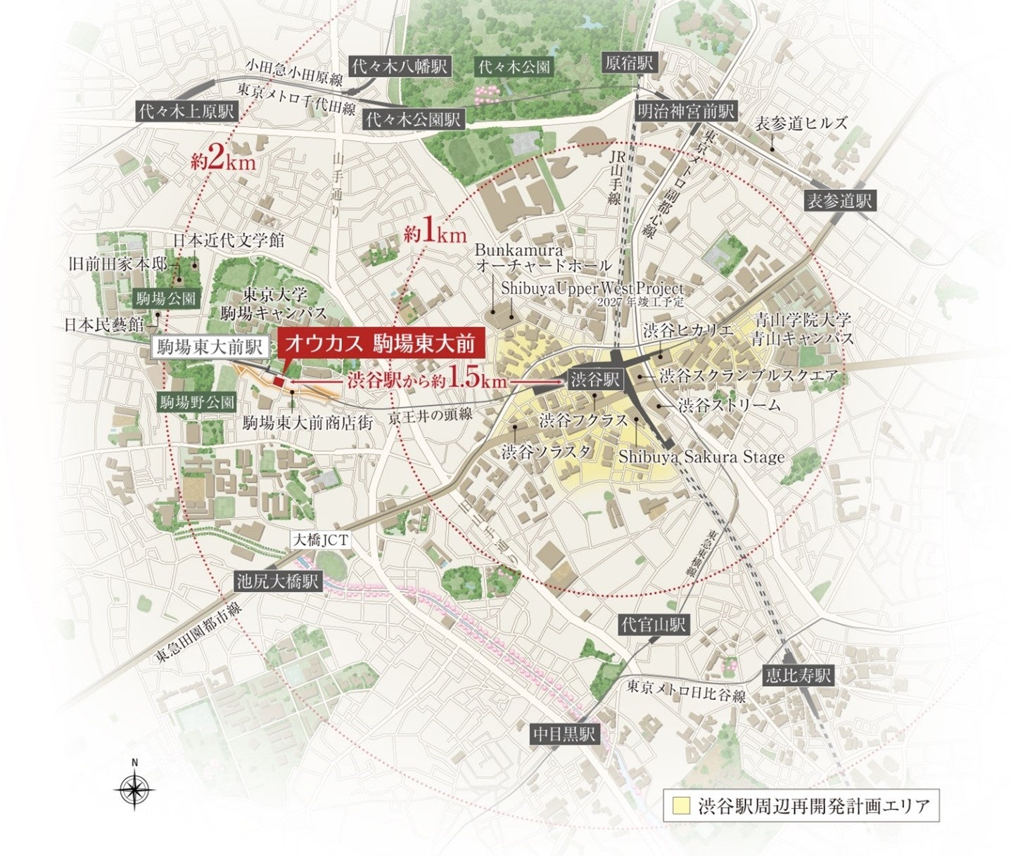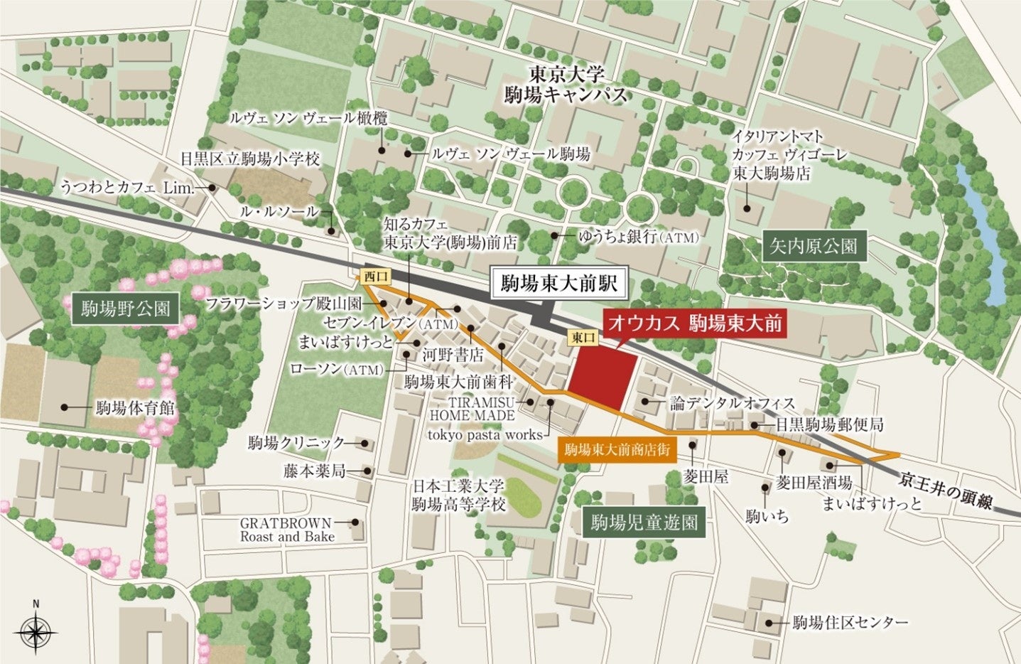 1.渋谷駅約1.5km圏、駒場東大前駅徒歩2分、北側東京大学駒場キャンパスの緑を臨む立地に展開