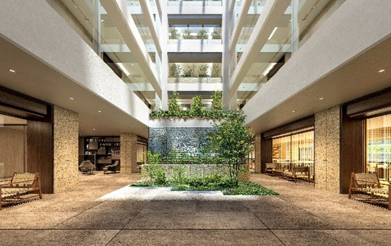 本計画はオウカスシリーズのフラッグシップ物件として、「光・風・緑を享受する個邸」をコンセプトに、ご入居者一人ひとりのライフシーンをイメージし、永く住むほどに居心地の良さを感じていただける空間設計・デザインとしました。建物中央に位置するエントランスホールは5層の吹き抜け空間とし、天井部には自然光が差し込むトップライトを、フロア部には壁泉をイメージしたガラスブロックの修景壁とグリーンを配することで、明るく優雅な共⽤空間を演出します。また、最上階5階には、東京大学駒場キャンパスの緑を臨むルーフトップガーデンを計画。建物内外部で自然を身近に感じる環境を創出します。