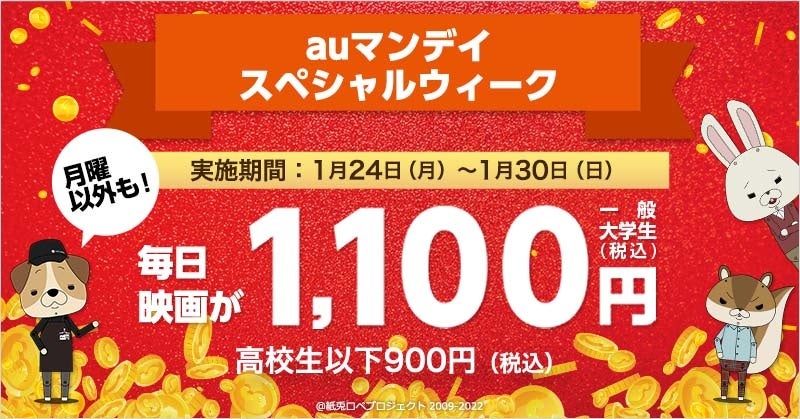 au以外の方も使える!KDDI×TOHOシネマズ 好評につき、再度開催「auマンデイ スペシャルウィーク」1月24日からの1週間、映画が毎日1,100円!