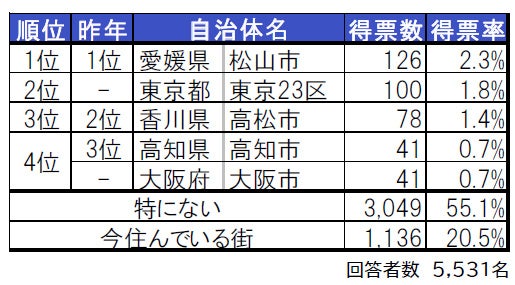 今年は全国の自治体を対象とした集計方法に変更しましたが(昨年は四国内の自治体のみを対象として集計)、1位は変わらず愛媛県松山市です。2位には、東京23区が新たにランクインしています。