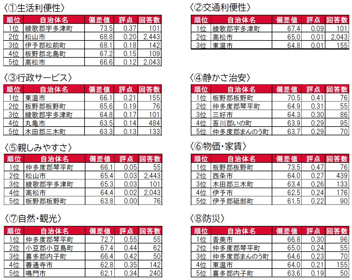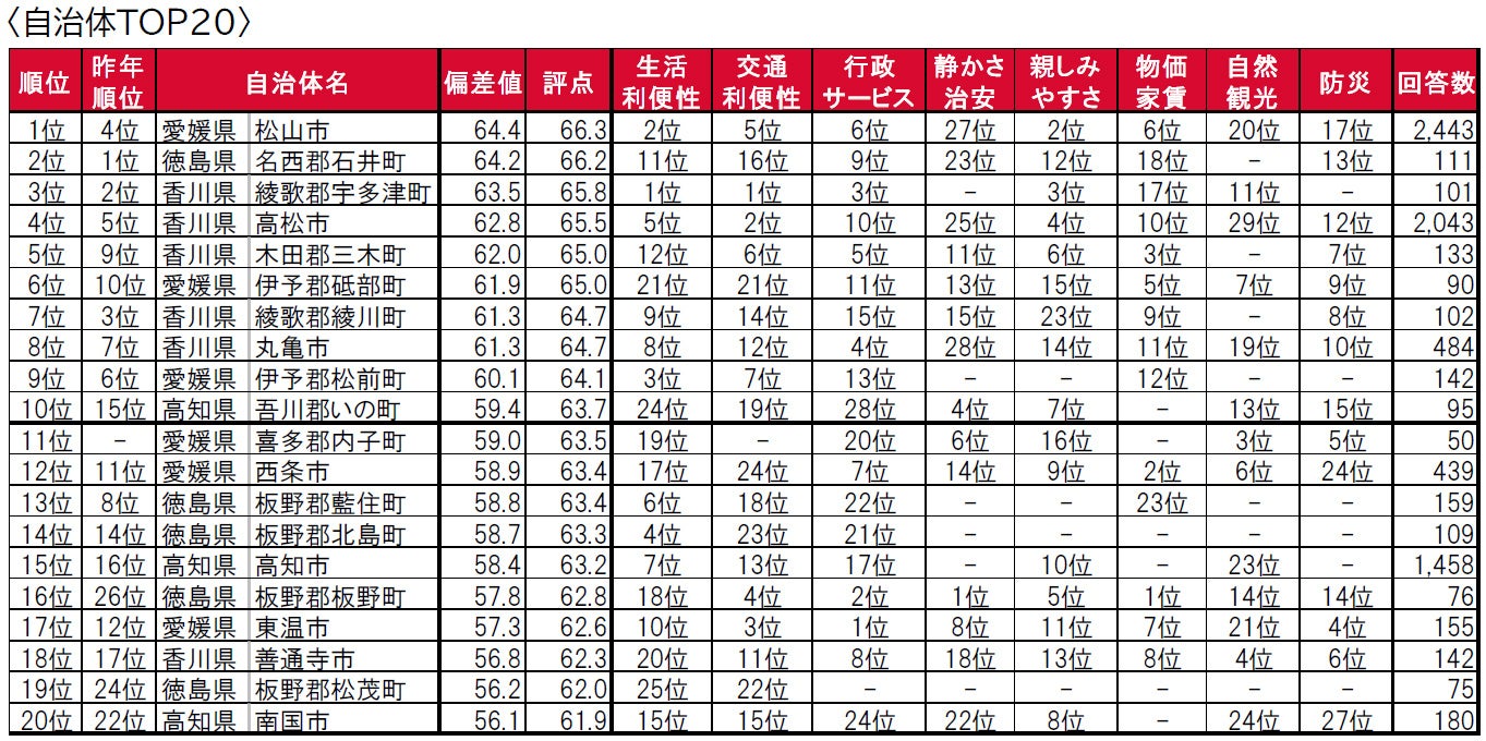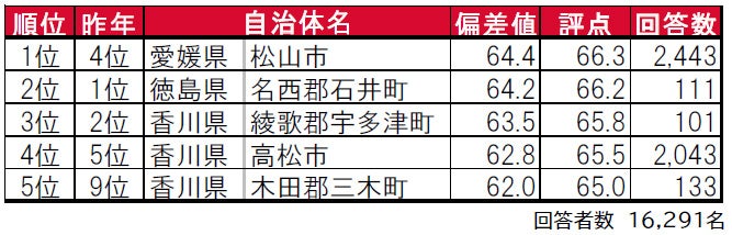 トップ10内では、香川県の自治体が最も多く5自治体ランクインしていますが、愛媛県3自治体、徳島県と高知県もそれぞれ1自治体ずつランクインしており、各県の自治体がまんべんなく並ぶ結果となっています。