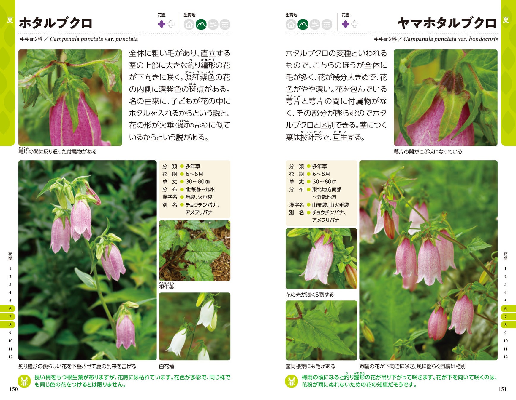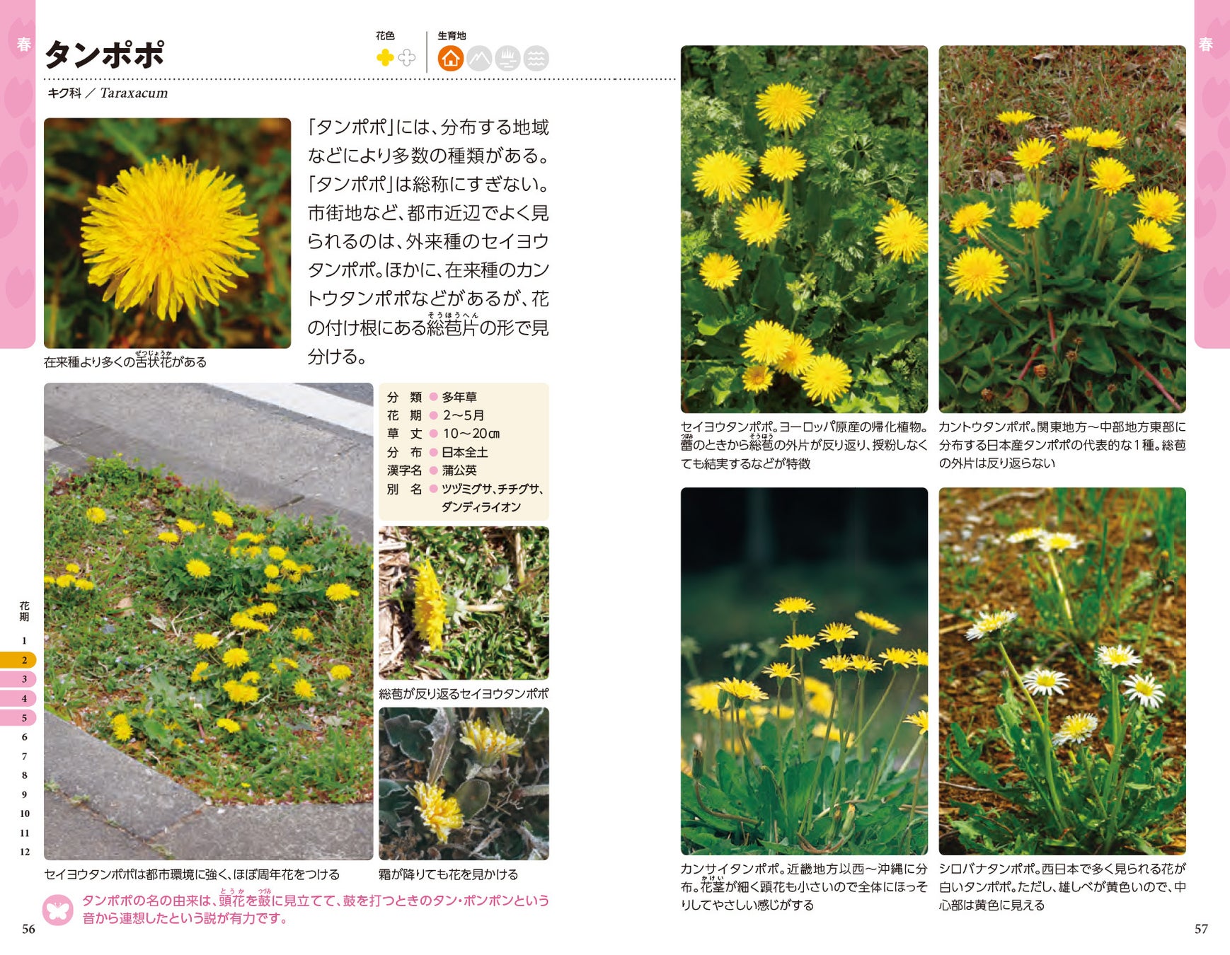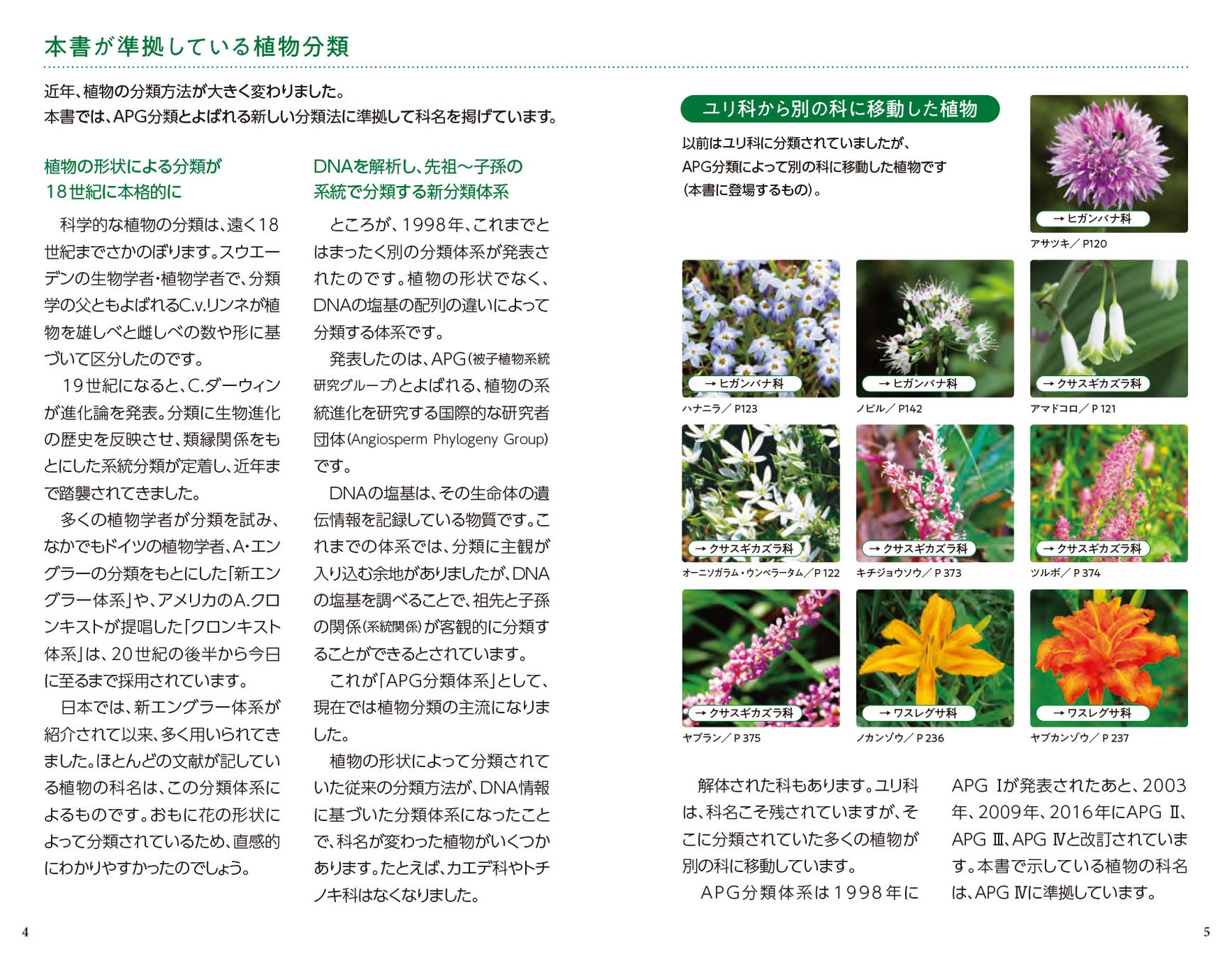 植物名や学名はAPG IV分類体系に準拠し、英文表記も併記。花のメイン写真に、クローズアップのサブ写真や、細部を解説する別アングルの小写真、詳細データの解説を掲載。花色、生育地、開花の季節、花期カレンダーは目で見てわかるアイコン情報にしました。