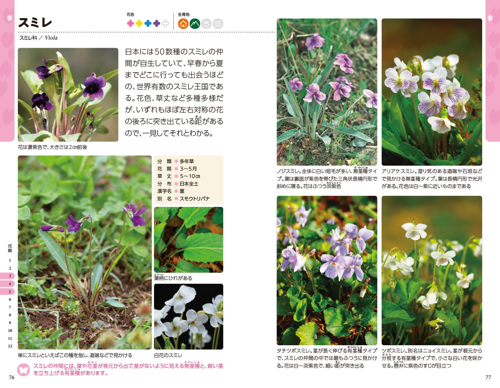 詳細データには、多年草などの分類、自然の中での花時期、別名や和名、日本国内での分布域、植物の丈、さらに知ってると得する植物の豆知識も掲載。ポケット版ながらこの一冊で、野の植物の特徴がよくわかる便利な図鑑です。