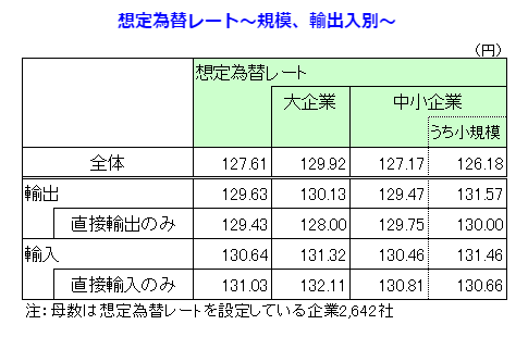 規模別では、「大企業」は129.92円、「中小企業」は127.17円、中小企業のうち「小規模企業」は126.18円だった。規模が大きくなるほど円を安く想定する傾向がある。「直接輸入のみ」を行っている企業では、「大企業」(132.11円)は「小規模企業」(130.66円)より1.45円の円安水準を想定している。他方、「直接輸出のみ」では、「大企業」が128.00円、「中小企業」が129.75円、「小規模企業」が130.00円となり、輸入企業とは逆に小規模企業ほど円安水準を想定していた。