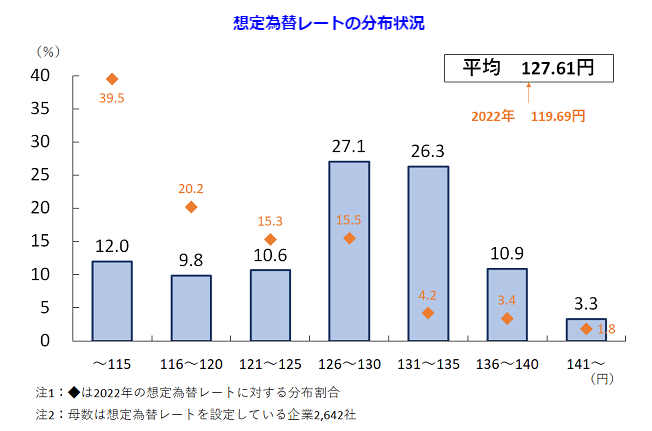 2023年4月時点における、企業の想定為替レートは平均1ドル=127.61円(以下、1米ドル当たりの円レートを示す)となった。前年4月時点の119.69円から7円92銭の円安水準を想定していた。また中央値、最頻値はともに130円だった。
