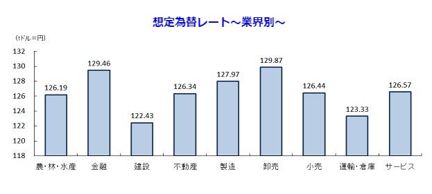 想定為替レートを業界別にみると、『卸売』や『金融』が129円台を想定している一方で、『建設』や『運輸・倉庫』の2業界は120円台前半とみている。