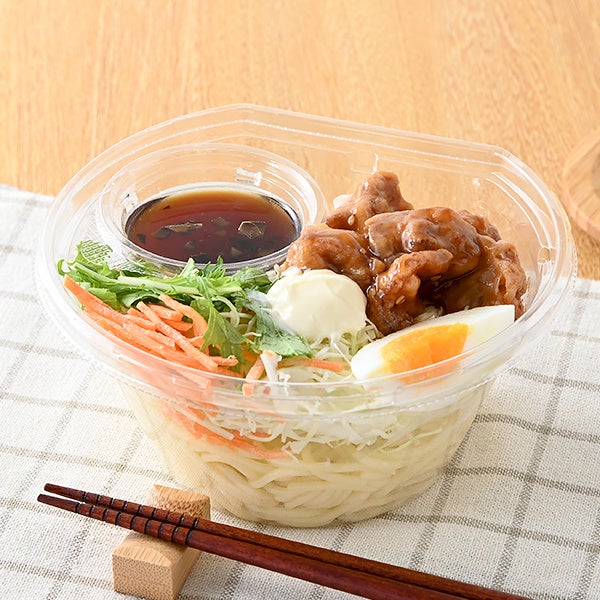 【内容】甘辛いタレで和えた唐揚げをトッピングしたパスタサラダ。別添えの玉ねぎ醤油ドレッシングは、九州の醤油を使用し、コクと旨みを楽しめます。