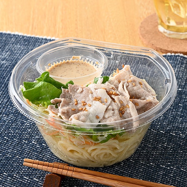 【内容】豚しゃぶをトッピングしたパスタサラダ。別添えの練り胡麻やすりごまを加えたドレッシングをかけて召し上がると、ごまの豊かな風味をお楽しみいただけます。豚しゃぶには、食べ応えのある厚切りの豚もも肉を使用しています。