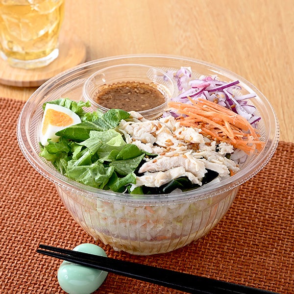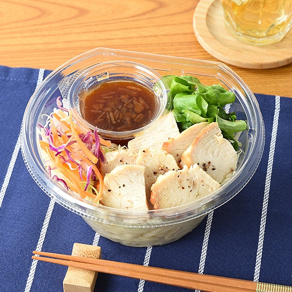 【内容】ローストチキンをトッピングしたパスタサラダ。別添えの和風オニオンドレッシングには、”料理が美味しくなる調味料”として定評がある八方だしを加えて、これまでよりも味わい深く仕上げました。
