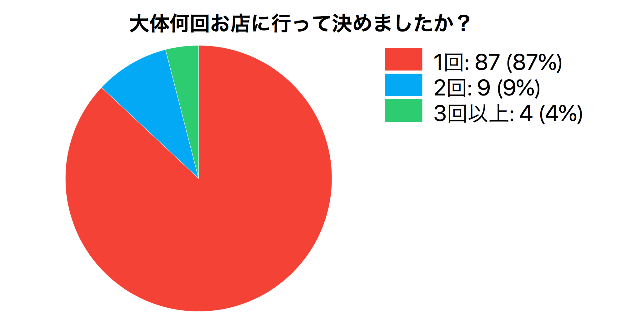 「Q4.大体何回お店に行って決めましたか?」と質問したところ、「1回」が87%、「2回」が9%、「3回以上」が4%という結果になりました。