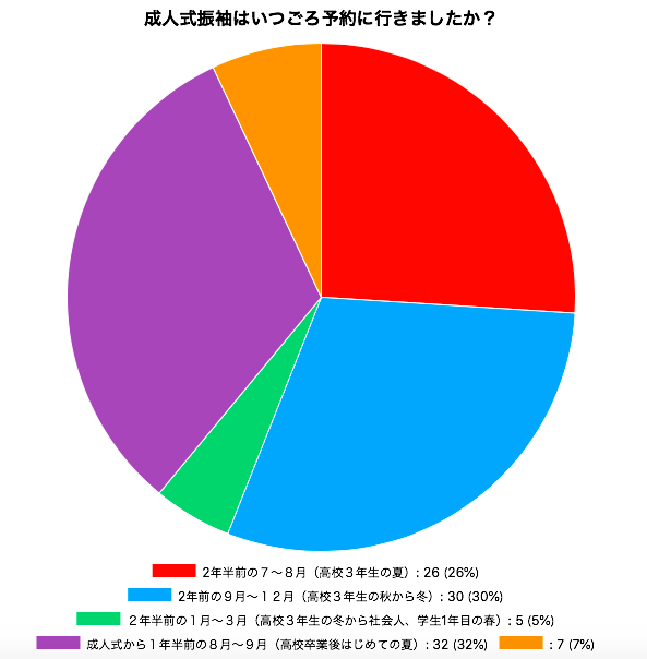 新作振袖の発表は大体いつ頃なのか?いつまでにいかないと遅いのか?などたくさんの疑問を抱えているかと思います。そこで今回調査したのは、先輩方はいつ頃成人式の振袖を予約しに行っているかの調査です。人生でたった一度しかない成人式。せっかくなら自分に似合っていて、自分のお気に入りの振袖で参加したいものですよね。今回の調査では、新型コロナウイルスの影響からか、早めにお店に見にいき、決めてしまう方が多い傾向にあるのかも知れません。せっかくの人生一大イベントなので失敗したくないと入念に準備を進める方が多いのだと考えられます。