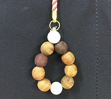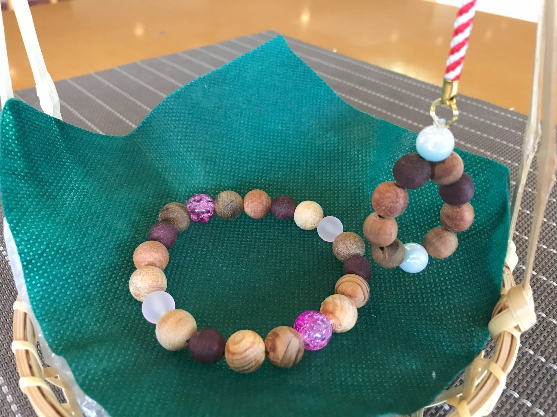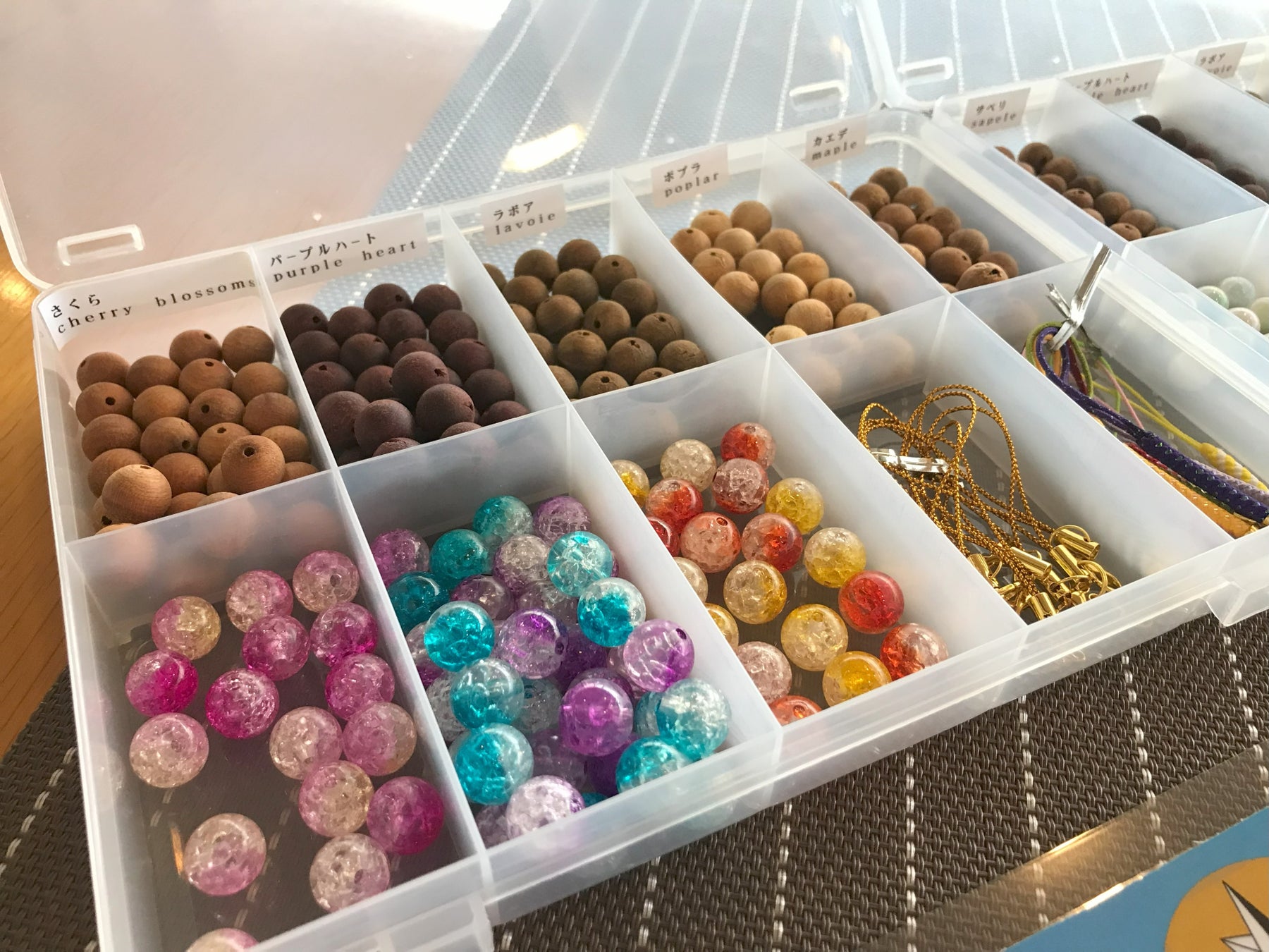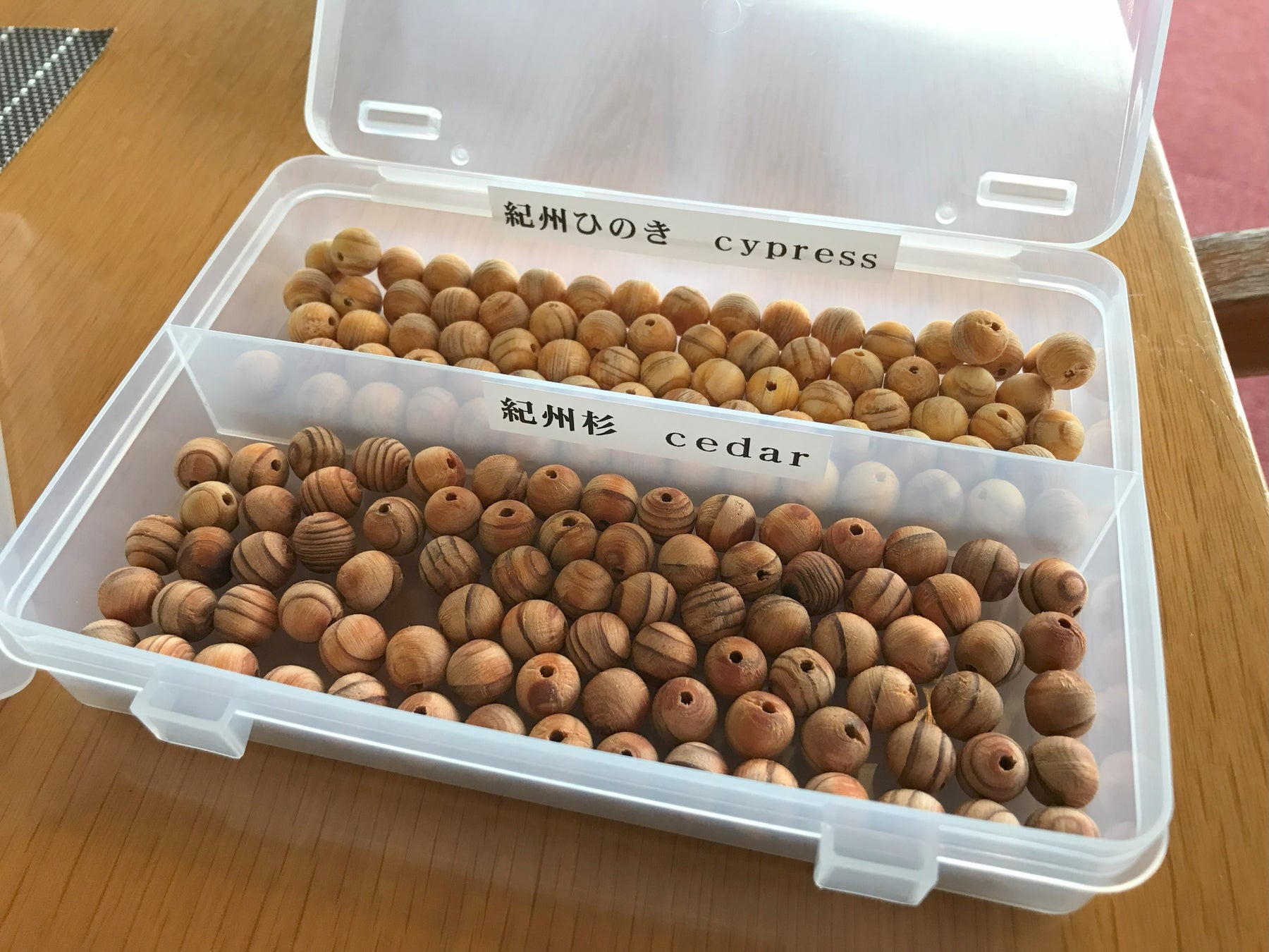 和歌山県の木材を使用した木工製品を製作している和歌山市のクラフト工房「Fcube WoodCraft」の協力のもと、紀州材の木玉ビーズを製作。そのビーズを使用した数珠アクセサリー作り体験です。