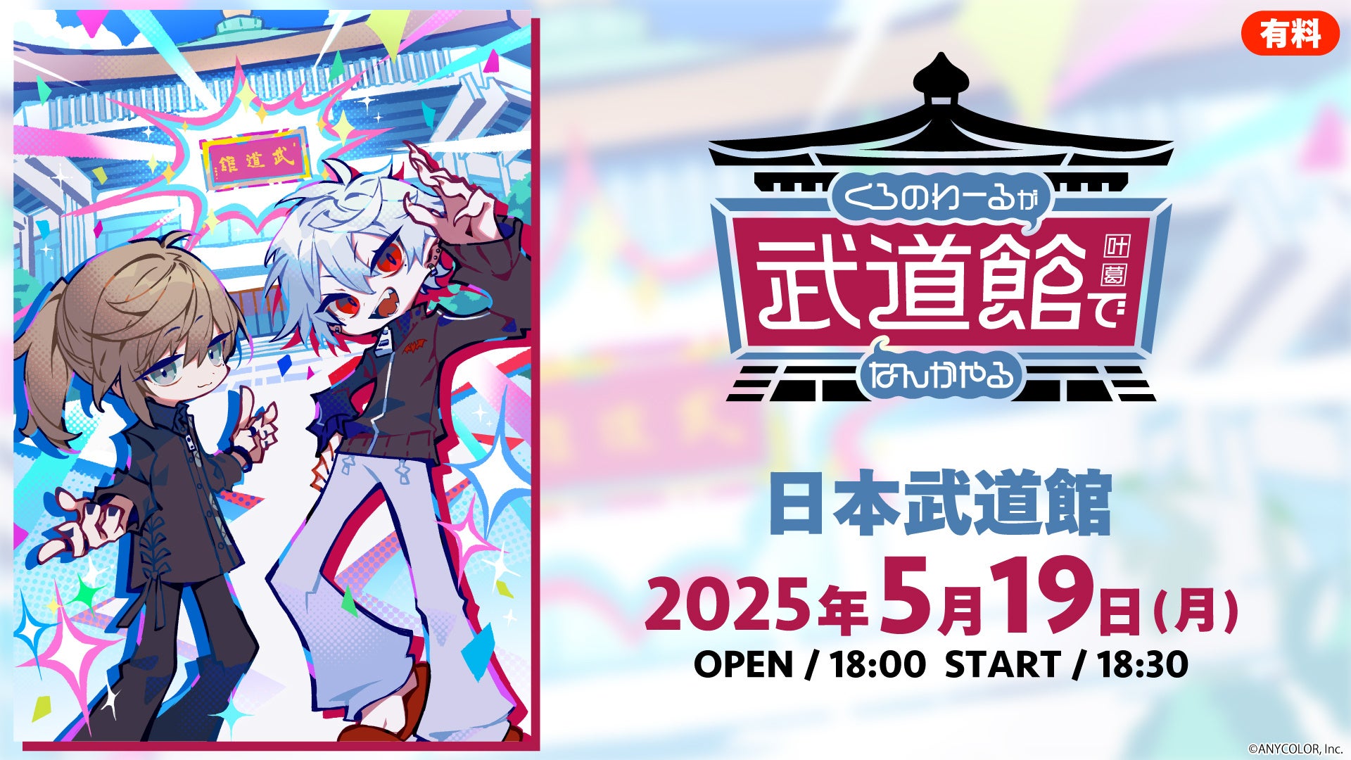 株式会社ドワンゴは、ライブ配信サービス「ニコニコ生放送」にて、VTuber / バーチャルライバーグループ「にじさんじ」所属の2人組ユニット「ChroNoiR」(読み:くろのわーる / 叶・葛葉)の公式番組が初開催するリアルイベント「くろのわーるが武道館でなんかやる」を、5月19日(月)18時30分より、現地会場の日本武道館より国内独占生配信します。