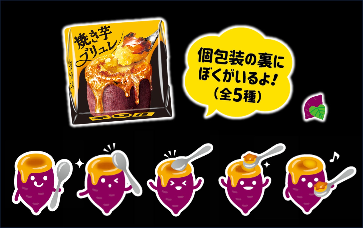 個包装の裏面には、楽しみながら食べられるようオリジナルキャラクターがワンポイントでデザインされています。(全5種類、ランダム封入)