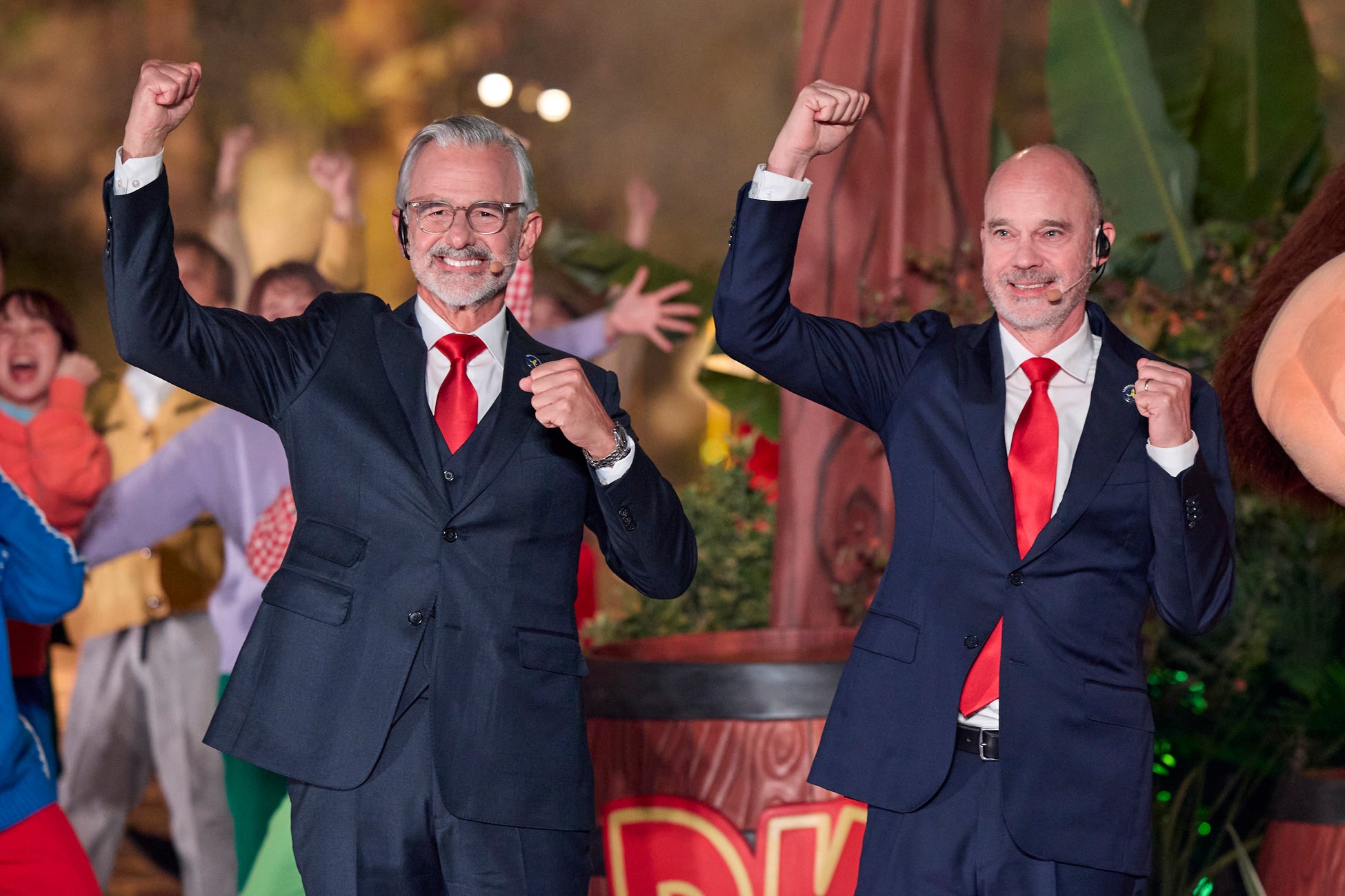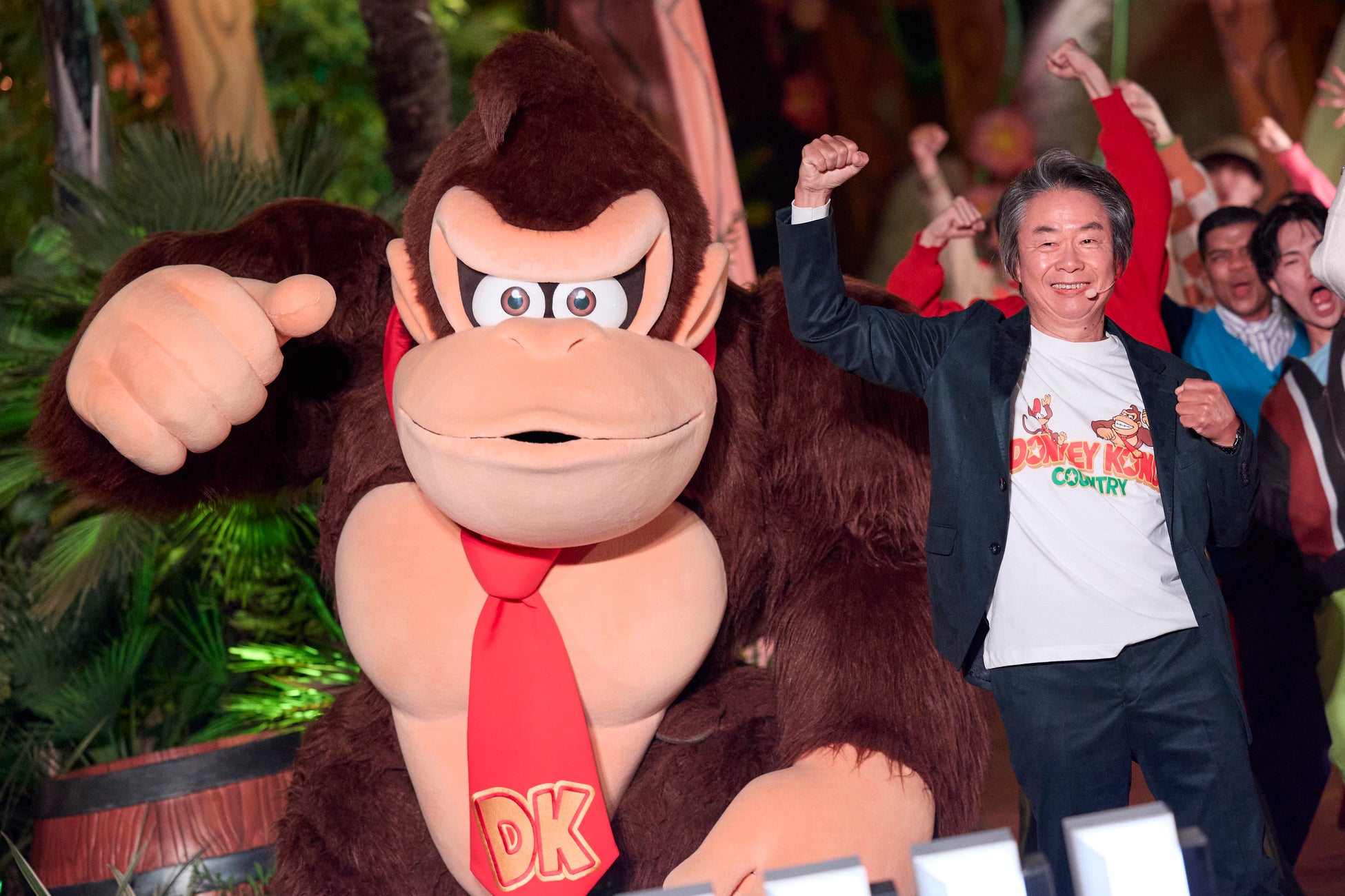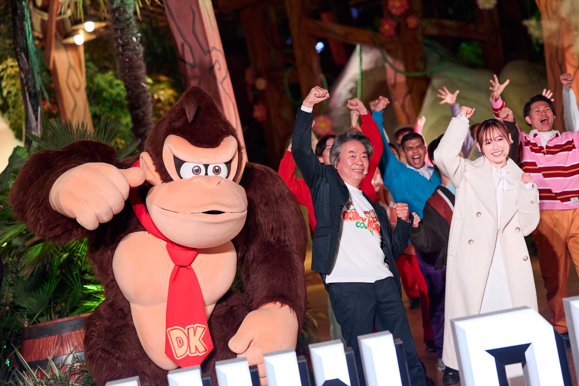 本日午後5時30分ごろ、『ドンキーコング・カントリー』の緑がいっぱいのジャングルに、任天堂株式会社 代表取締役フェロー 宮本茂氏、『スーパー・ニンテンドー・ワールド』に来場以来、パークの大ファンとなった、国民的人気俳優 福原遥さん、ユニバーサル・ディスティネーション&エクスペリエンス会長兼CEO マーク・ウッドベリー、合同会社ユー・エス・ジェイ 社長CEO J.L.ボニエが登場、「ドンキーコング」とともに、開業記念前夜祭に臨みました。壮大なライティング演出で迎えた前夜祭では、ジャングル最奥にそびえるエリアのシンボル「黄金のしんでん」と、『ドンキーコング・カントリー』全体がカラフルな生き生きとした光にあふれ、“本能が大爆走”することを体現したエンターテイナーたちの超元気なパフォーマンスによって、記念すべき新エリア誕生を控えた前夜に会場は超興奮と超感動に包まれました。