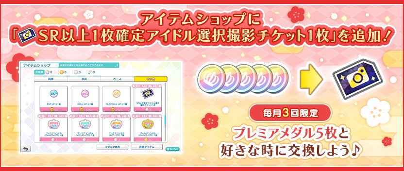 「SR以上1枚確定アイドル選択撮影チケット1枚」をアイテムショップに追加!