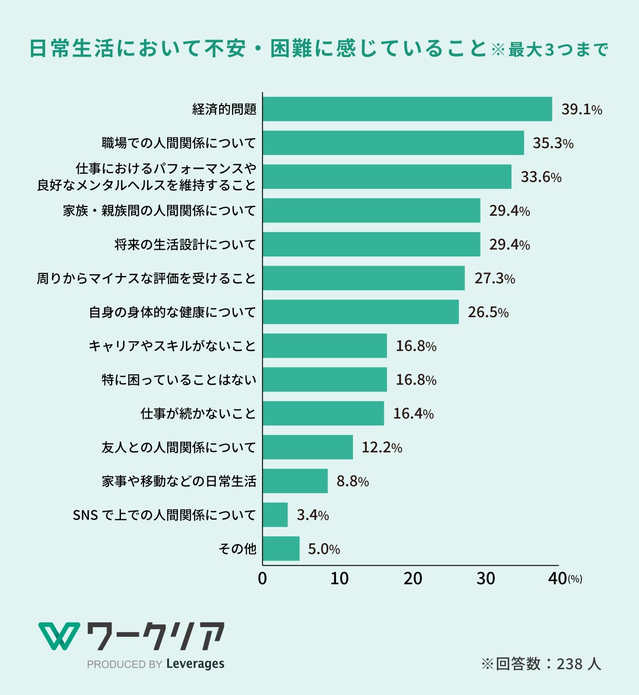 その中で、最も回答割合が多かったのは「経済的問題(39.1%)」でした。精神疾患は、体調が不安定になるケースも多く、安定的に就業することへのハードルが高いことから、経済的な不安に繋がっていることが予想されます。