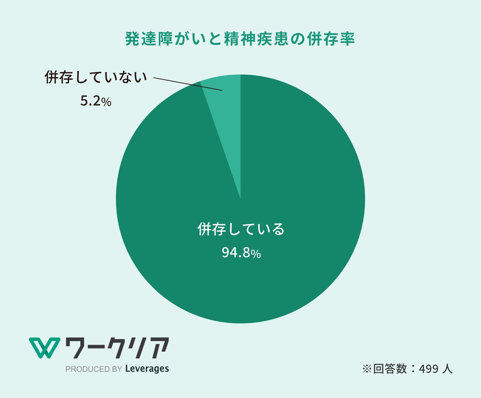 発達障がいの診断を受け、精神障害者保健福祉手帳を取得している499名を対象に、発達障がいと精神疾患の併存について調査したところ、併存率は約95%に上ることが明らかになりました。