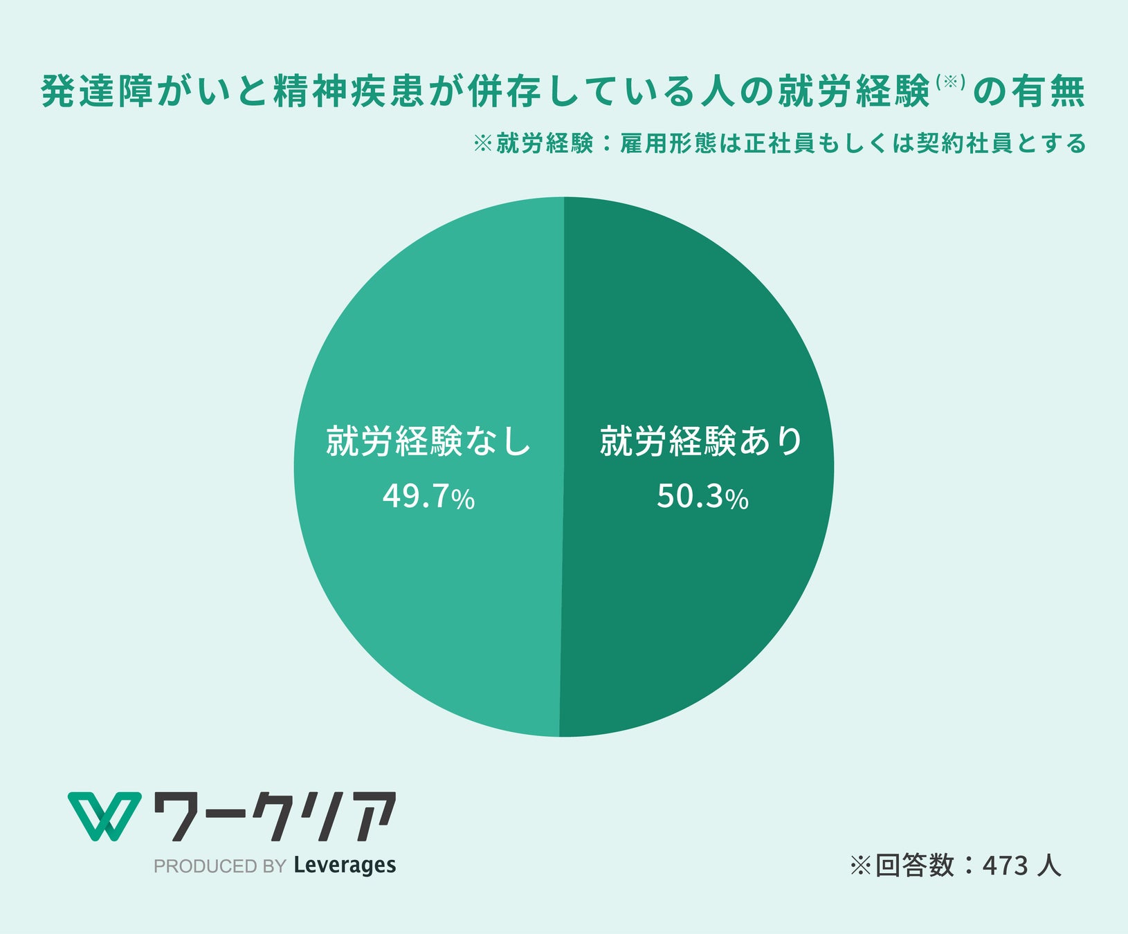 発達障がいと精神疾患を併存している人の約半数は、今まで「正社員もしくは契約社員での就労経験がない(49.7%)」と回答しています。