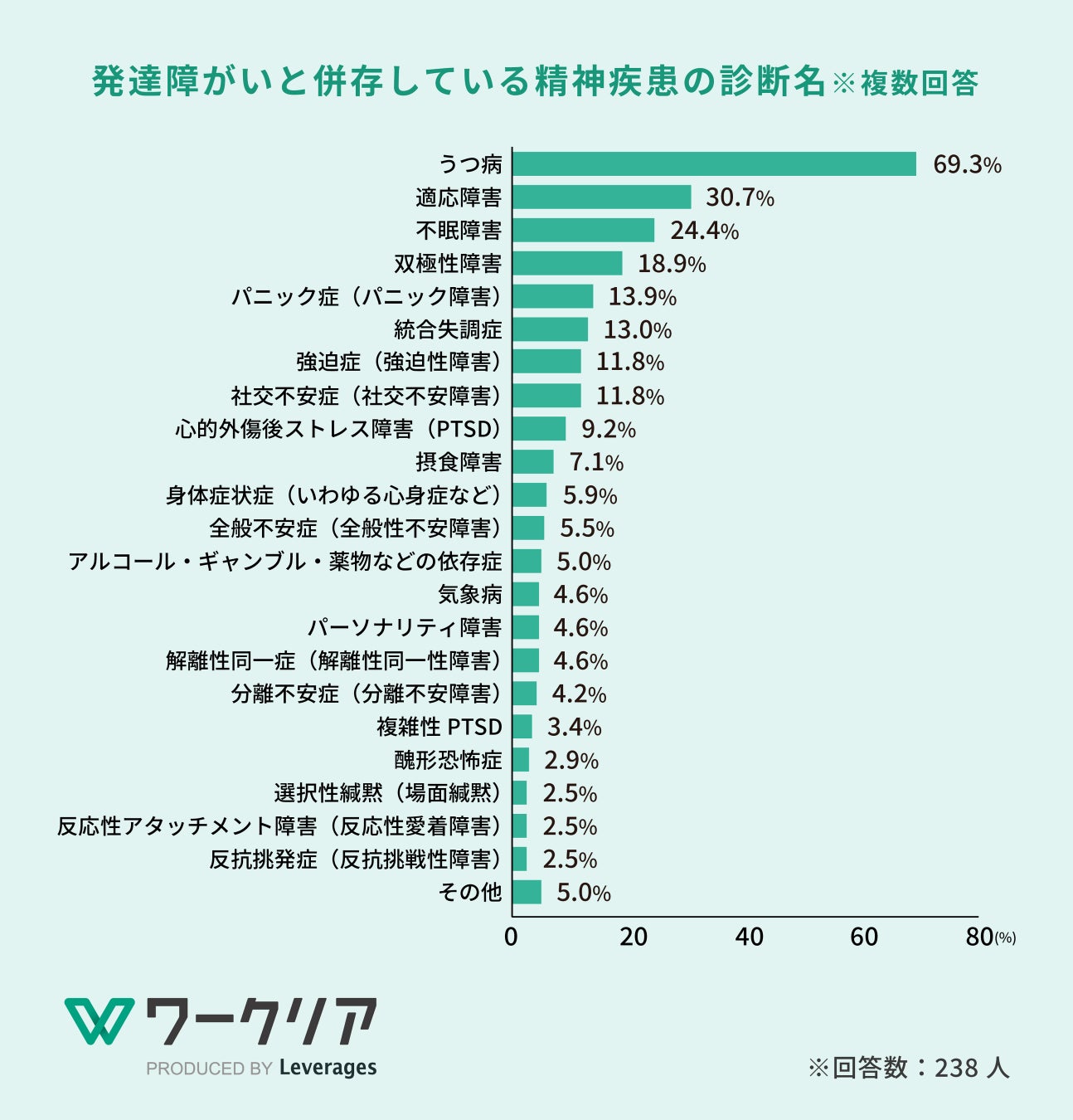 レバレジーズ株式会社が運営する障がい者就労支援サービス「ワークリア」( https://worklear.jp/ )は、発達障がいの診断を受け、精神障害者保健福祉手帳を取得している20~60歳の男女499名を対象に、発達障がいと精神疾患の併存に関する実態調査を実施しました。