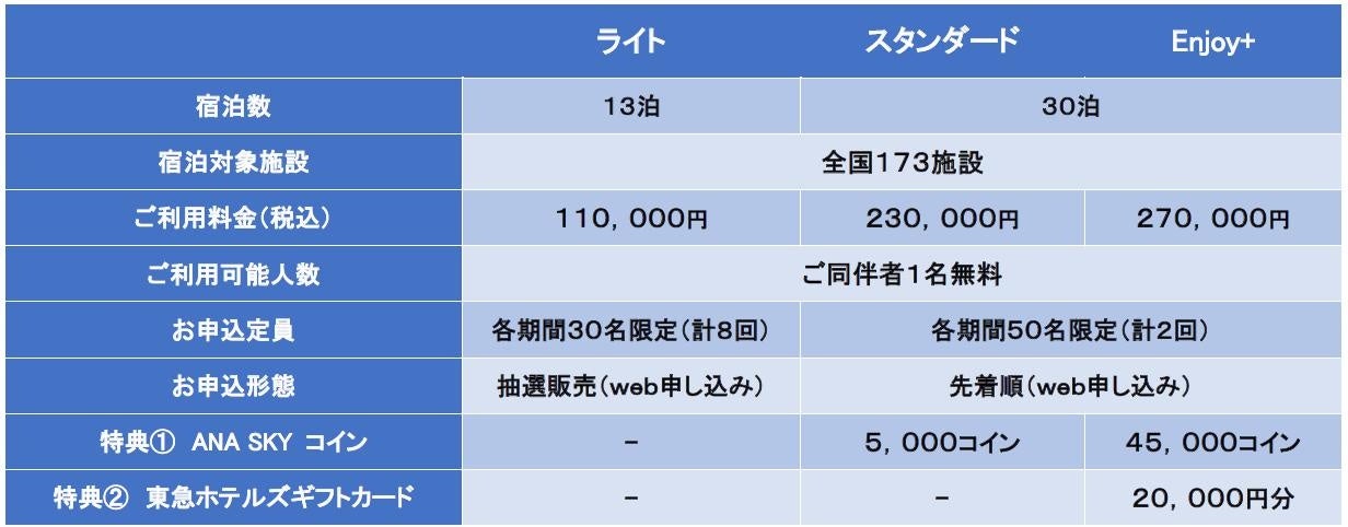 本募集では、一番人気の30泊プランとこれまで多くのご要望をいただいていたライトプランとして13泊プランをご用意しています。30泊プランではこれまで通り、使い方の好みによって“スタンダード”“Enjoy+(エンジョイプラス)”より、ご希望のスタイルをお選びいただけます。なお、全プランで同伴者様1名まで無料にてご利用いただくことができ、各種連携サービスにより、移動や滞在先での暮らしをより一層お楽しみいただけます。