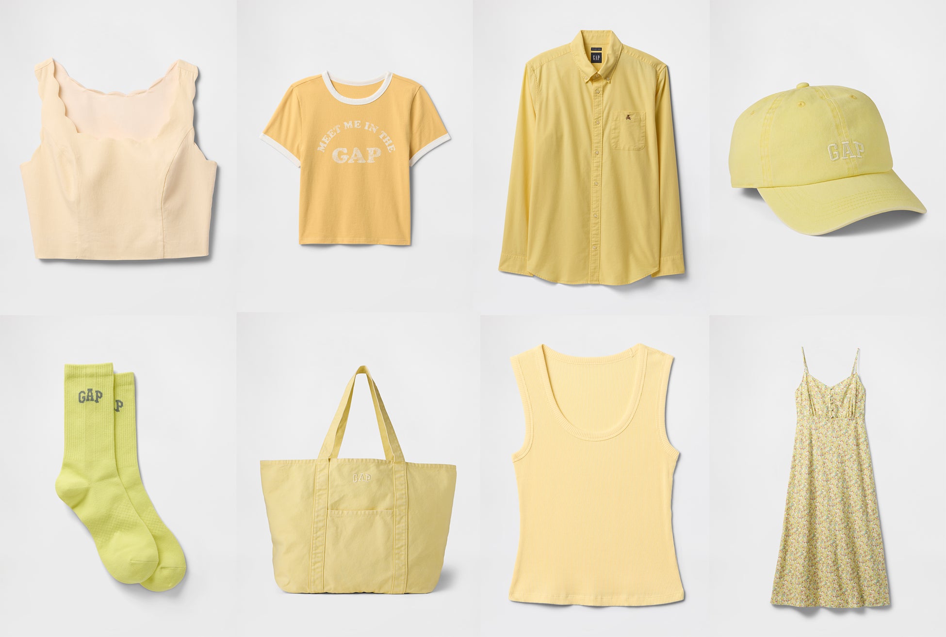 注目のアイテムは、コンパクトなシルエットで「Meet Me In The Gap」ロゴが施されたクロップドTシャツや、スカラップデザインが魅力のリネンスブレンドクロップドトップス、心地良い肌触りのリブ スクープネックタンクトップ、フラワープリントが春らしいリネン混マキシ丈スリップワンピース、Gapのアイコンキャラクター「ブラナンベア」の刺繍が施されたオックスフォードシャツ、外側と内側にパッチポケット付きで汎用性の高いコットントートバッグ、ミニGAPロゴがアクセントのベースボールキャップ、コーディネートのアクセントにもなるソックスなどです。