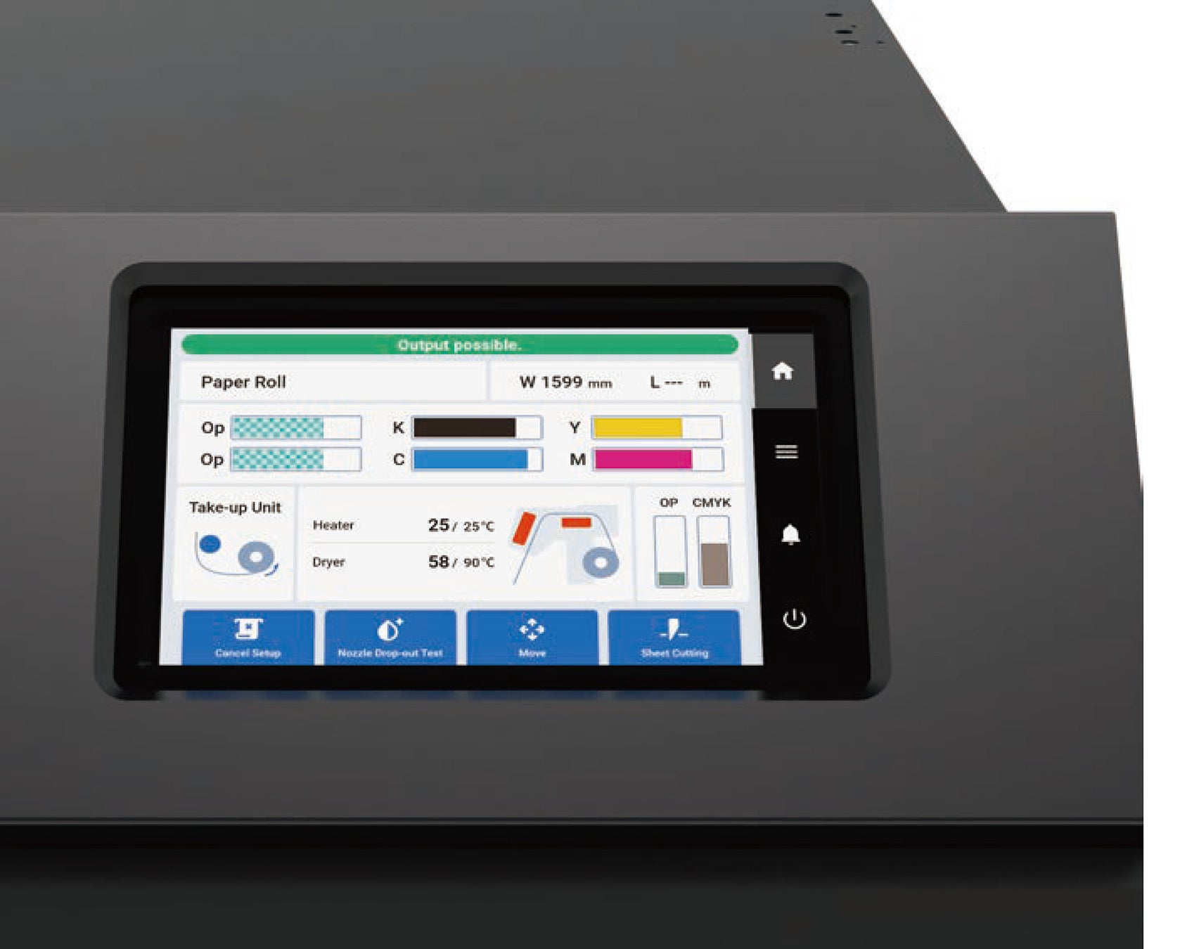 直感的かつ操作しやすい7インチタッチスクリーン液晶画面を搭載。ユーザーガイダンスなども表示されるため、初心者でも安心して使用できる。インクは巻き取り機構のついた700mlの大容量インクパウチを採用することで、使用後に廃棄となる容器の削減に加え、インクを可能な限り最後まで使用できる設計になっている。
