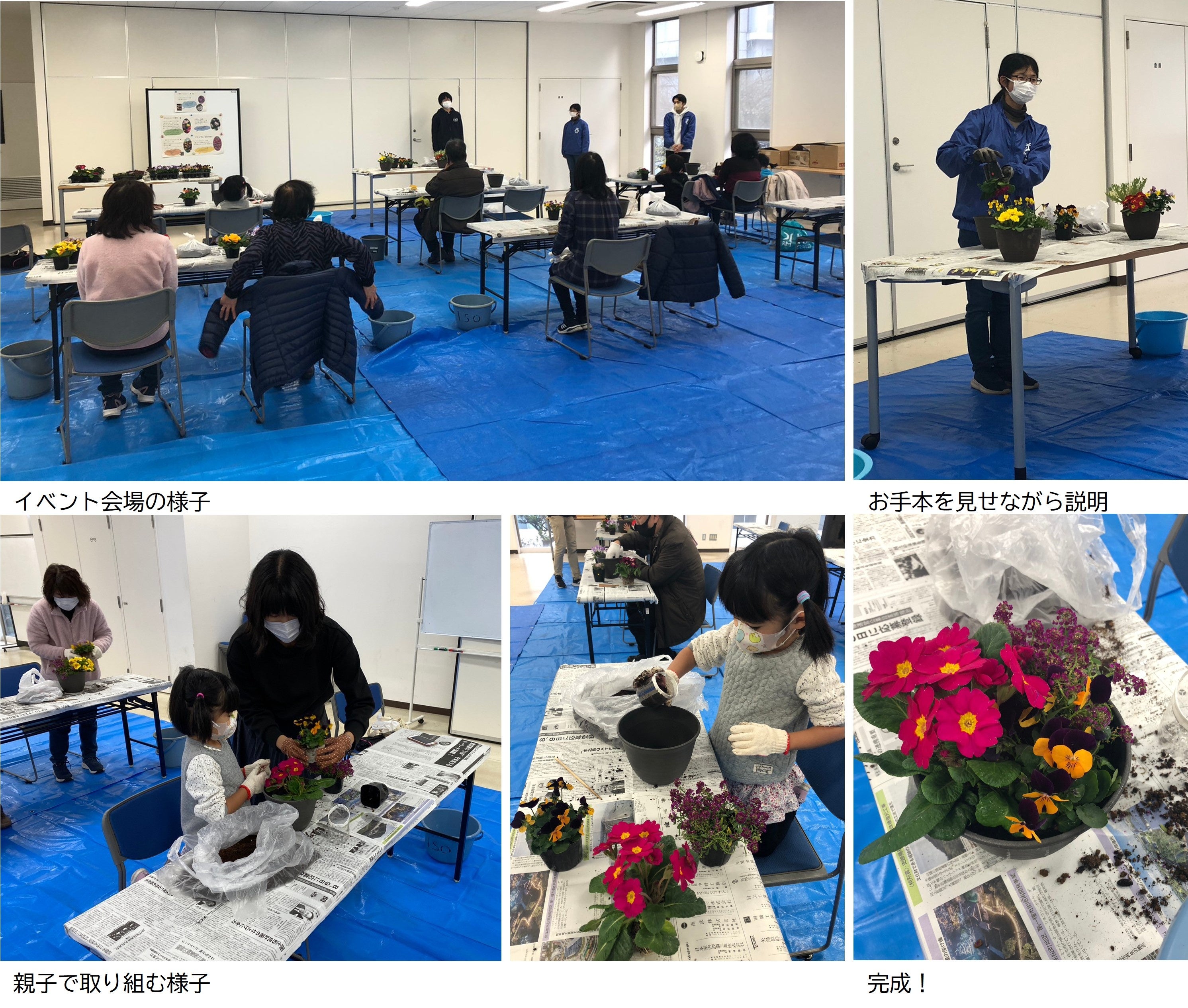厳しい寒さに負けず、元気な花々を楽しんでいだたきたいという願いを込めて、今年度の新企画として、寄せ植えイベントを提案しました。今回のイベントを通じて、植物への関心の輪が広がれば、地域の緑化にもつながると考えています。今回の寄せ植えは千葉大学柏の葉キャンパスの花卉園芸学研究グループで育った苗と、再生プラスチックを使った鉢を使用したところがポイントです。担当した学生たち自身が、寄せ植えの奥深さに驚かされながらも、植物への関心を深めることができました。イベント開催のためにご協力いただいた皆さん、イベントに参加してくださった皆さん、ありがとうございました。