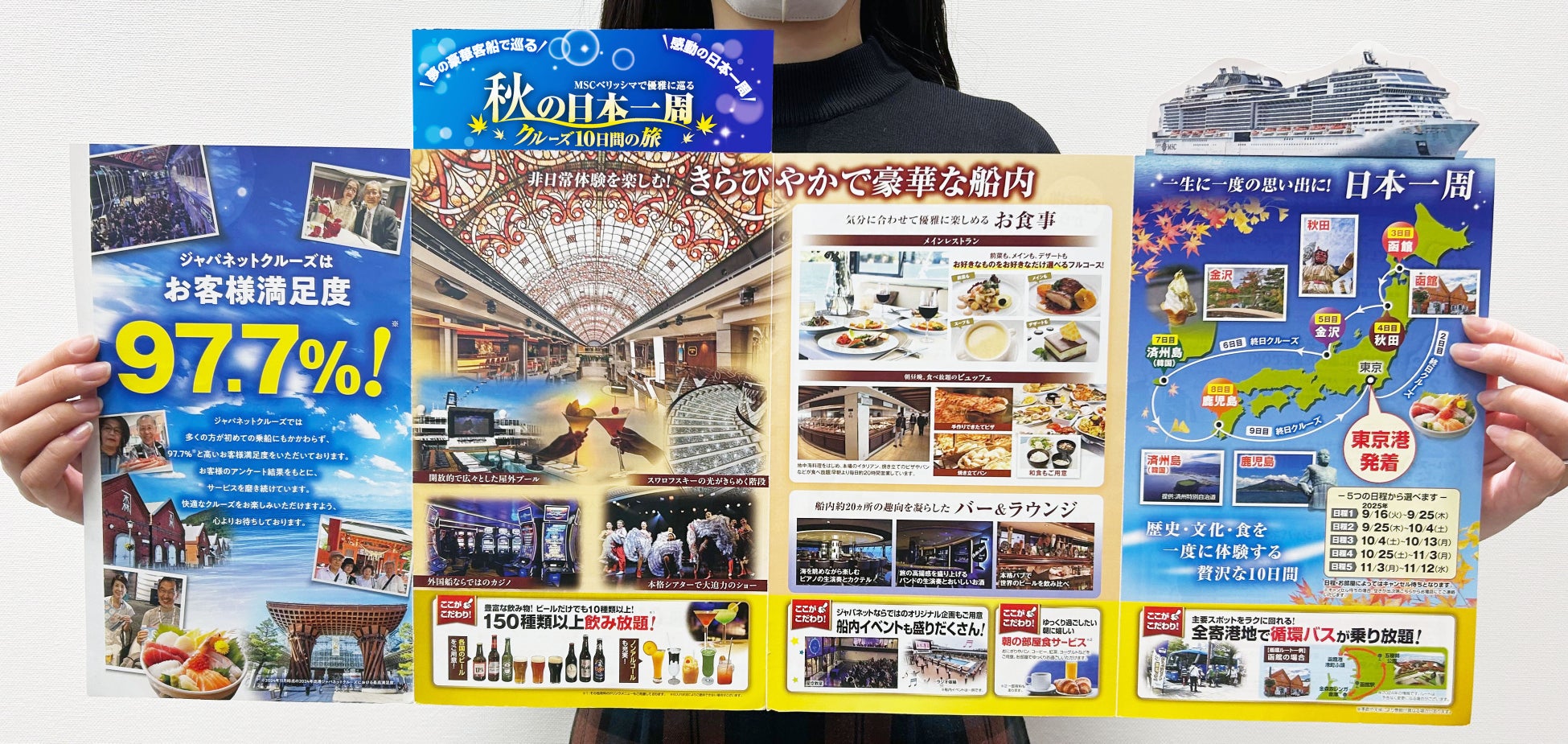 リアルな質感の追求:広告コピーに頼らず、「お客様満足度 97.7%」という実績や、顧客の「生の体験談」をそのまま掲載。家族で一緒に見やすい大判の紙面で、信頼性と旅への憧れを醸成しました。