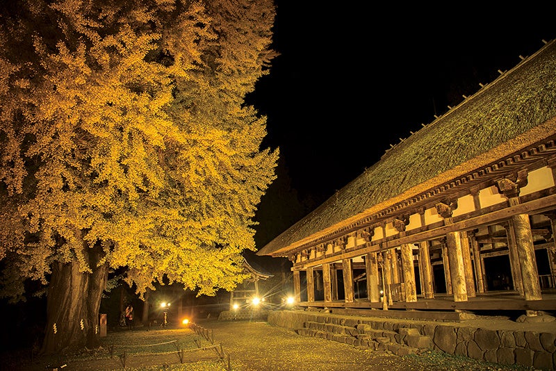 新宮熊野神社では、推定樹齢800年以上とも言われる大イチョウが参拝者を出迎えます。すぐそばには、国重要文化財の拝殿「長床」があり、大イチョウのライトアップ時には一層荘厳な雰囲気が醸し出されます。ライトアップ期間は、アクセスにも便利な珍しいボンネットバスが特別企画として運行予定です。