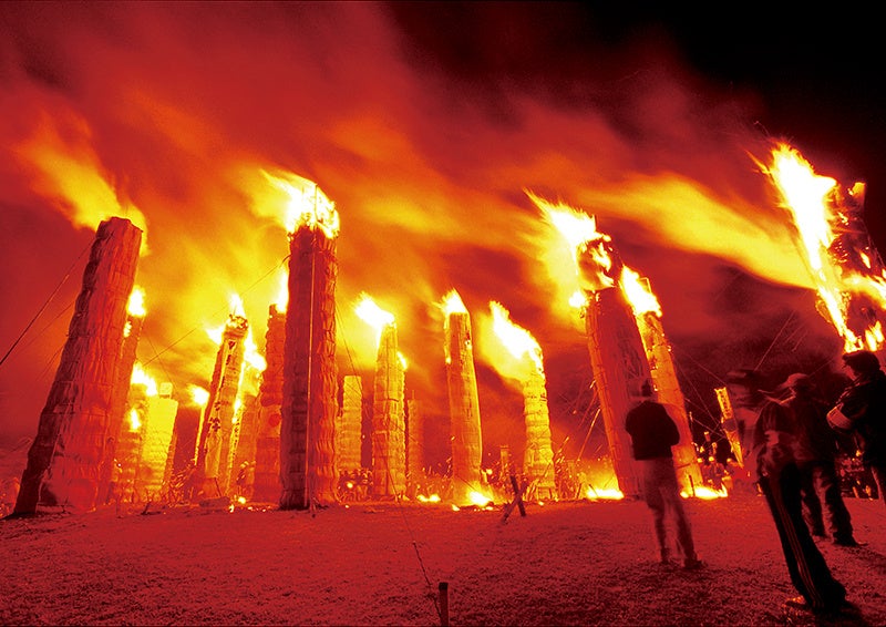 戦国の世の悲運を偲んで開催される伝統の火祭り。長さ6~10m、重さ1~2tもの松明が市内を練り歩いた後、翠ヶ丘公園内の五老山に約20本立ち並び、松明太鼓の演奏が響く中、堂々と燃え盛ります。