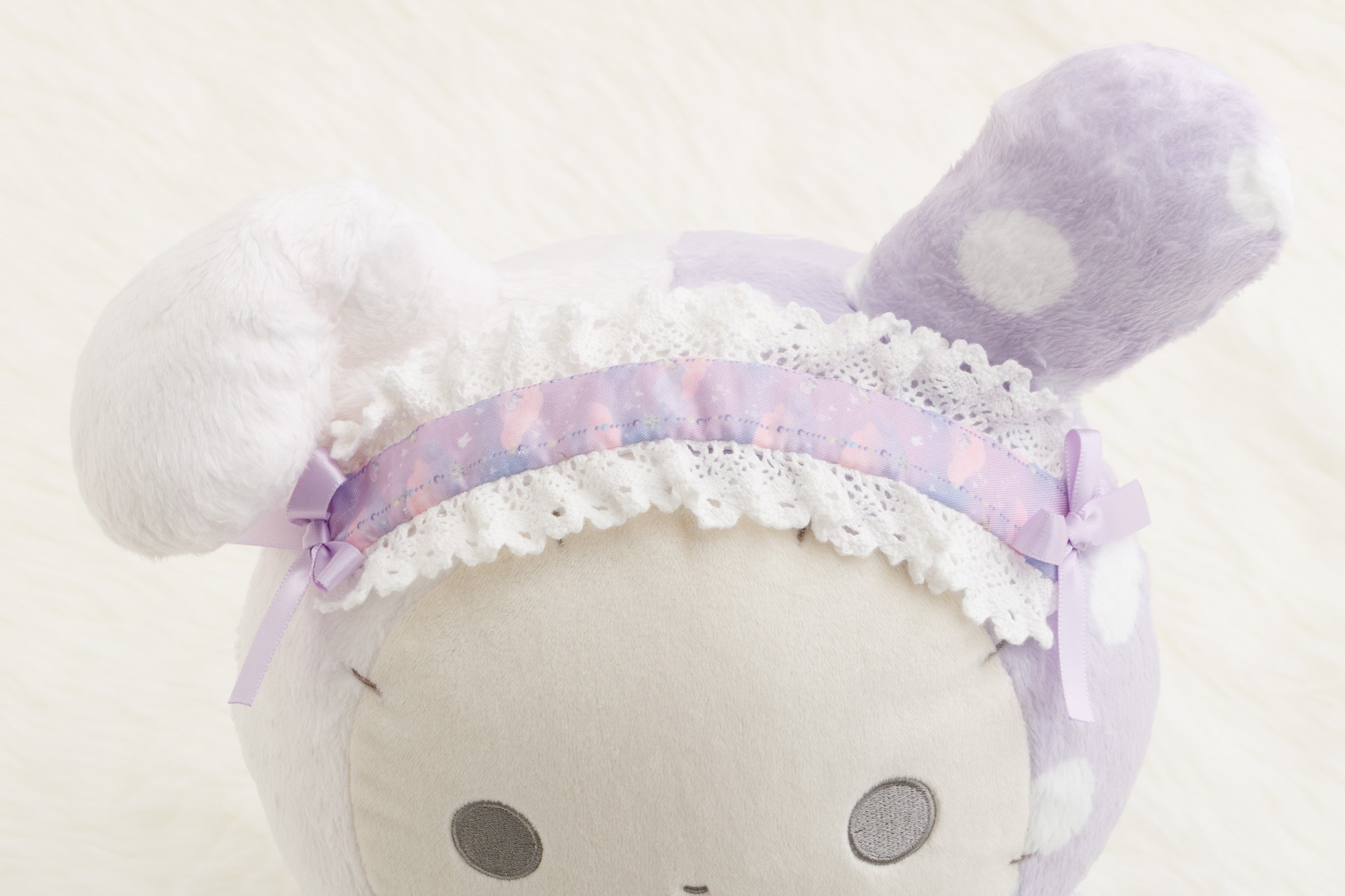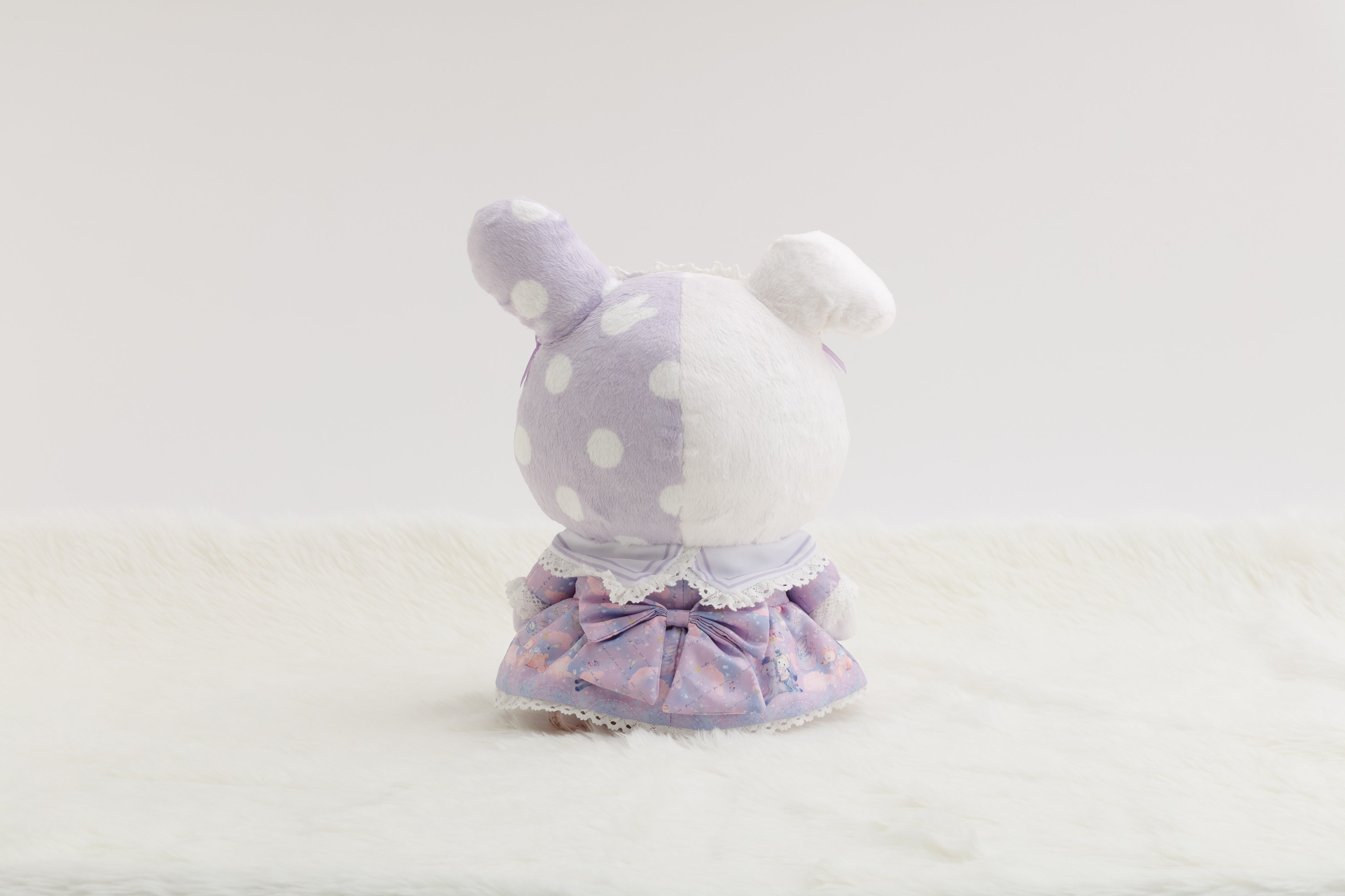 2025年2月に受注販売し、即完売したBABY, THE STARS SHINE BRIGHTとのコラボレーションワンピースとヘッドドレスを身に着けたシャッポのぬいぐるみ。