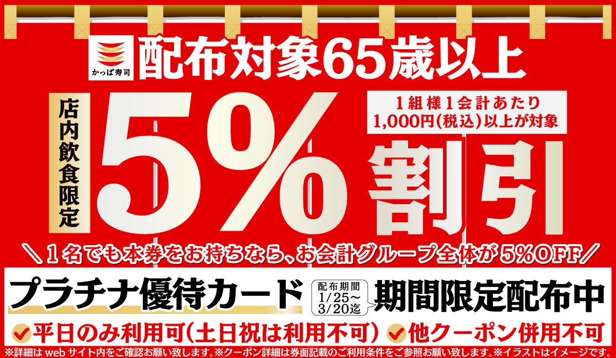 ・サービス内容:かっぱ寿司にて、店内飲食を1,000円(税込)以上ご利用いただき、レジにて65歳以上の方が「プラチナ優待カード」をご提示いただいた際、お会計より5% (税込)割引いたします。