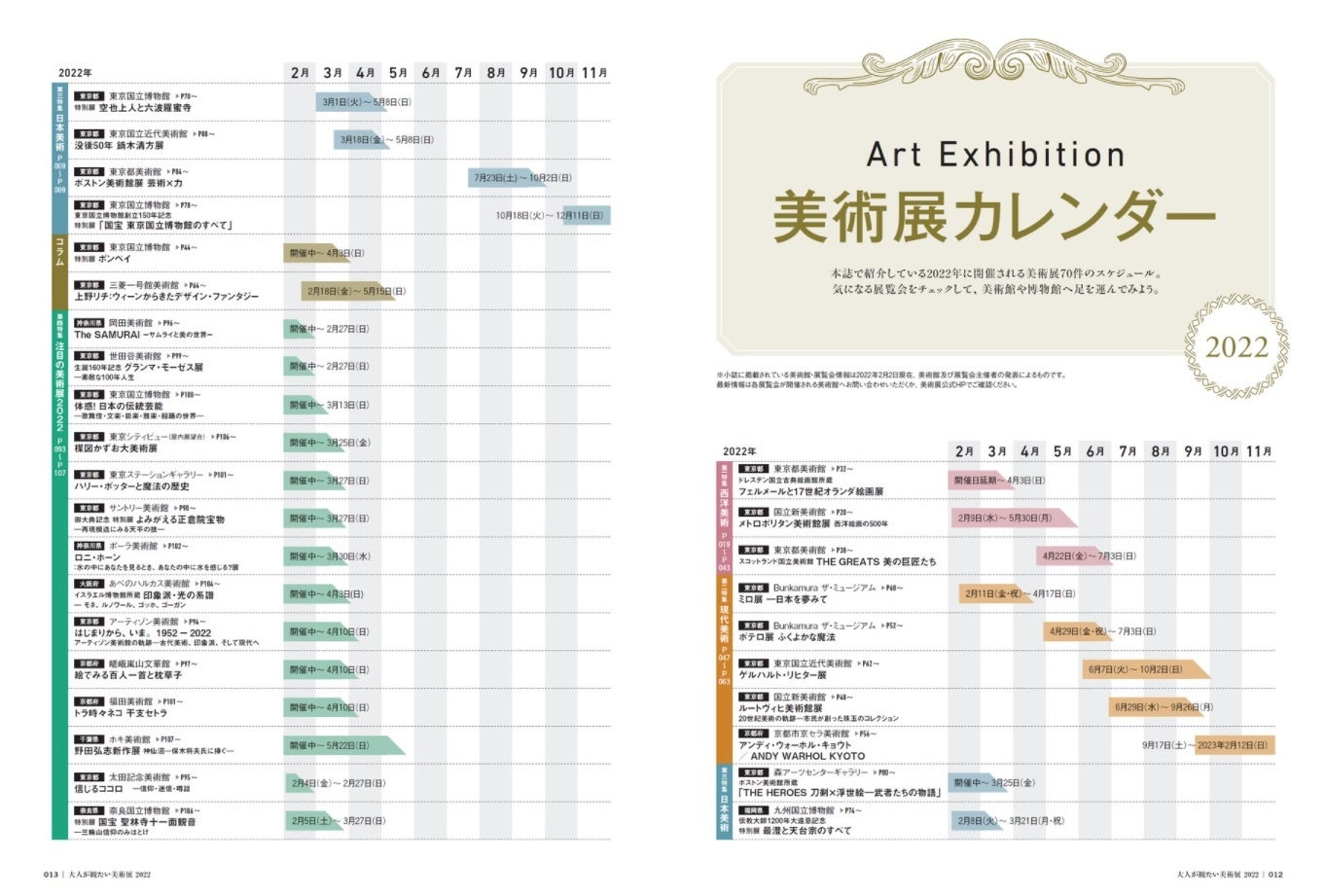 本誌で紹介している2022年に開催される美術展70軒のスケジュールを掲載。気になる展覧会をチェックして、美術館や博物館へ足を運んでみよう。