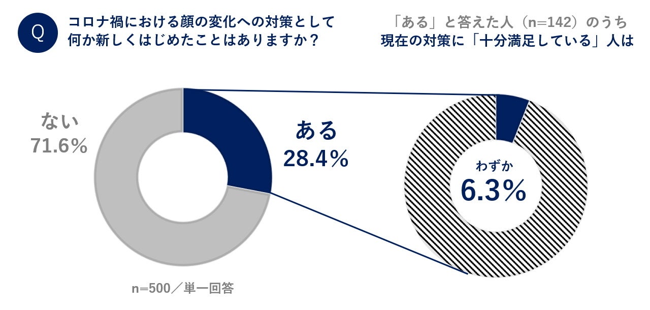 それでは、こうした変化に対して、女性たちは何か対策を講じているのでしょうか。「コロナ禍における顔の変化への対策として、何か新しくはじめたことはありますか?」と聞いたところ、「ある」と答えた人はわずか2割台(28.4%)に。残り大多数の女性たちは、コロナ禍における「肌の下り坂」現象に対して、新しいアクションが何もできていないということになります。