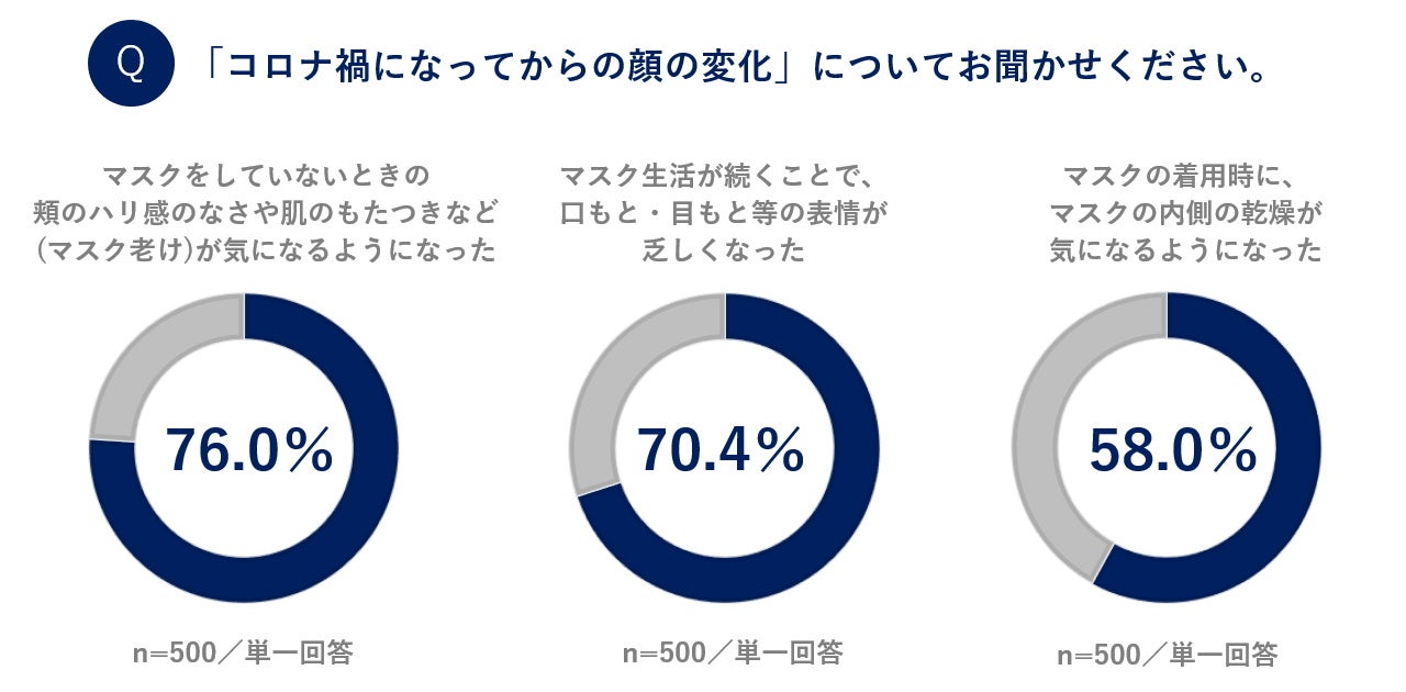 また、ほかにも「マスクの着用時に、マスクの内側の乾燥が気になるようになった」(58.0%)人が半数超、「マスク着用時の目もとのメイクに気合いが入りすぎて、皮膚に負担がかかり、乾燥やハリが気になるようになった」(27.6%)人も約4人に1人に。コロナ禍におけるマスク生活が、さまざまな顔や肌の変化を感じさせている様子がうかがえます。
