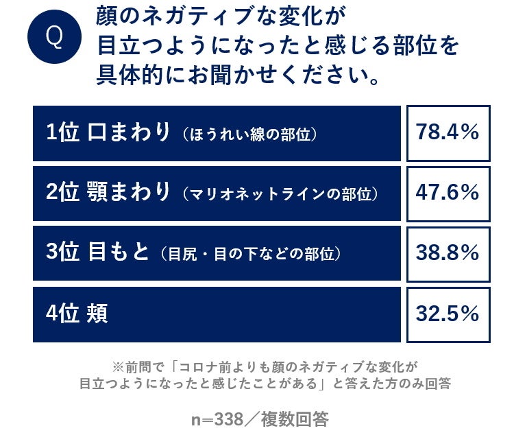 調査結果からは、コロナ禍における行動制限や行動変化が、肌や表情筋といった顔まわりにもさまざまな影響をおよぼしている様子がうかがえます。