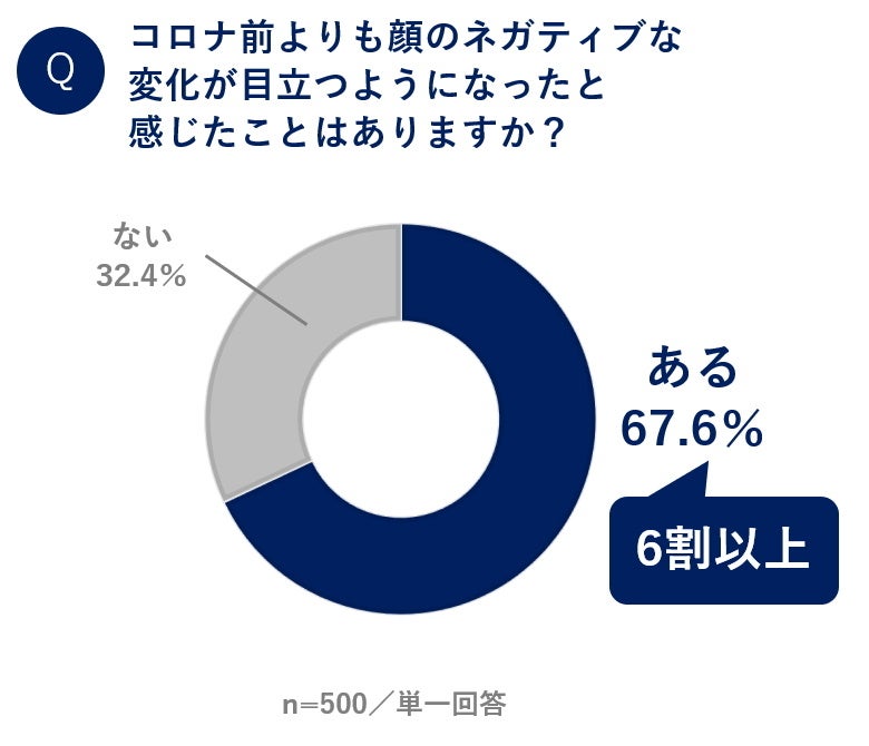 こうした背景をふまえ、あらためて、コロナ禍において「コロナ前よりも顔のネガティブな変化が目立つようになったと感じたことはありますか?」と質問したところ、67.6%が「ある」と回答。実に6割超の女性が、コロナ禍における「肌の下り坂」現象といえる状態を自覚していることがわかりました。
